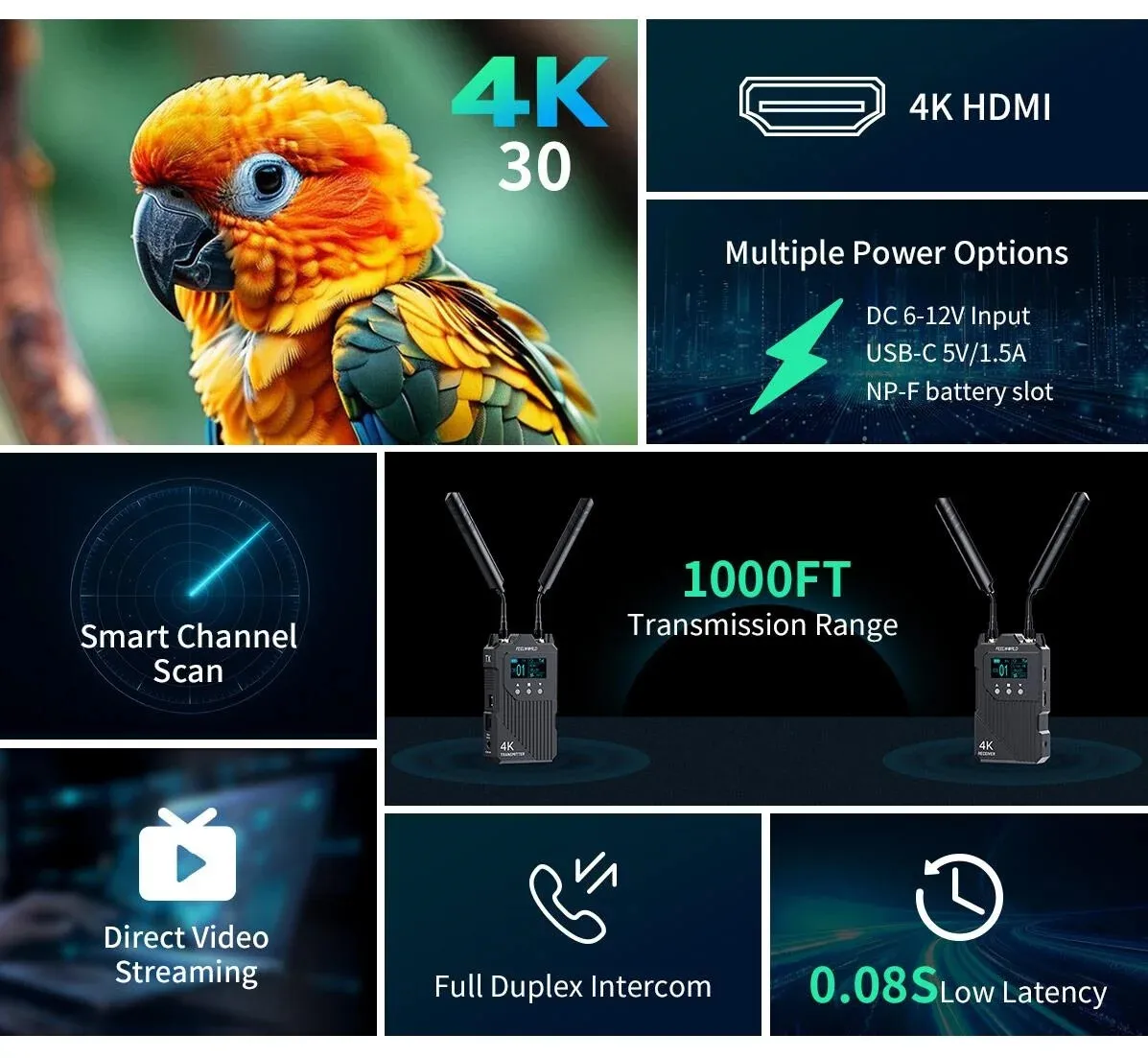 Baixa latência de 0,08S: Experimente monitoramento em tempo real com uma latência de apenas 0,08S, perfeito para filmagens em ritmo acelerado.