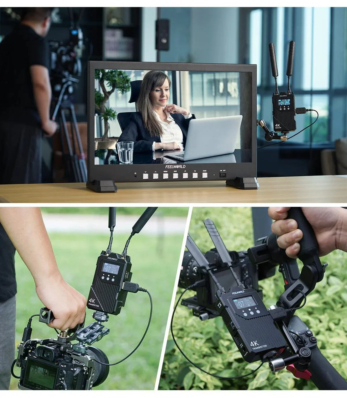 Monitor Halter|Receptor 4k Hdr|Alcance de transmissão de 1000FT: O alcance estendido de 1000FT garante transmissão de vídeo sem fio estável para filmagens em grande escala.