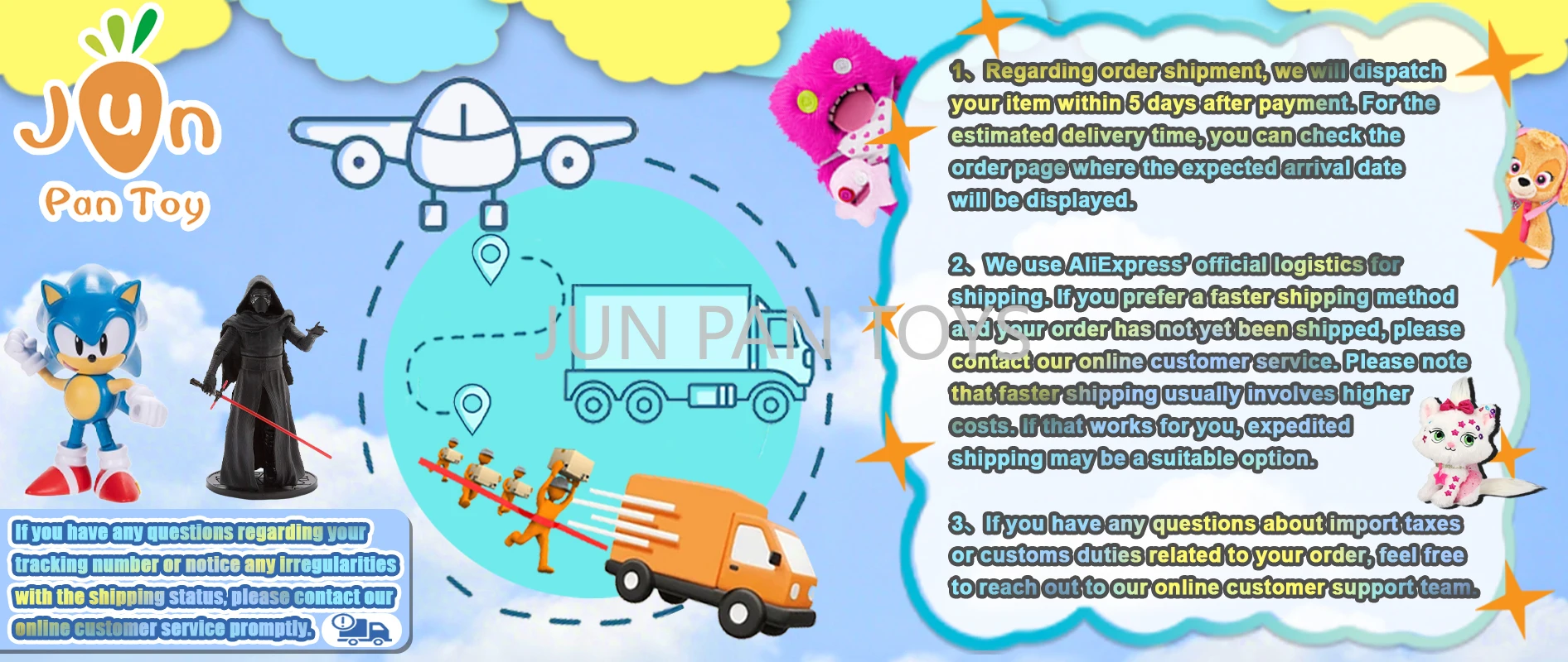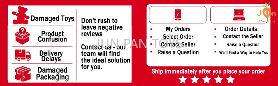 1、Valorizamos verdadeiramente sua experiência de compra e entendemos totalmente sua preocupação com possíveis danos aos itens durante o transporte.Também reconhecemos que você pode preferir medidas de proteção adicionais para seu pedido.É por isso que gostaríamos de compartilhar com você o processo de embalagem da JUN PAN TOYS.Você pode verificar as imagens abaixo para ver como embalamos os itens - isso pode ajudá-lo a se sentir mais confiante sobre sua compra.