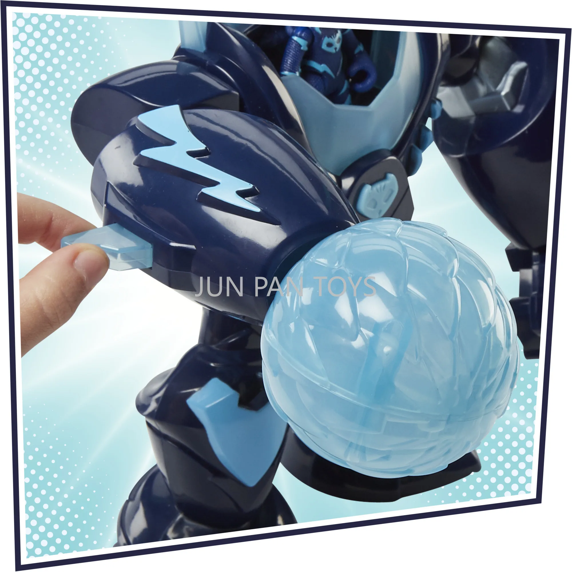 AÇÃO SUPER GATO: Os braços do brinquedo Robo-Catboy são equipados com um Power Furball de lançamento ativado por botão (amarrado por um cordão, para que não se perca) e Super Cat Stripes extensíveis