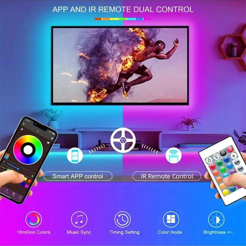 Fita de LED RGB com Sincronização Musical e Controle por Aplicativo, Luzes Flexíveis para Decoração de Festas em Casa e Iluminação Traseira de TV