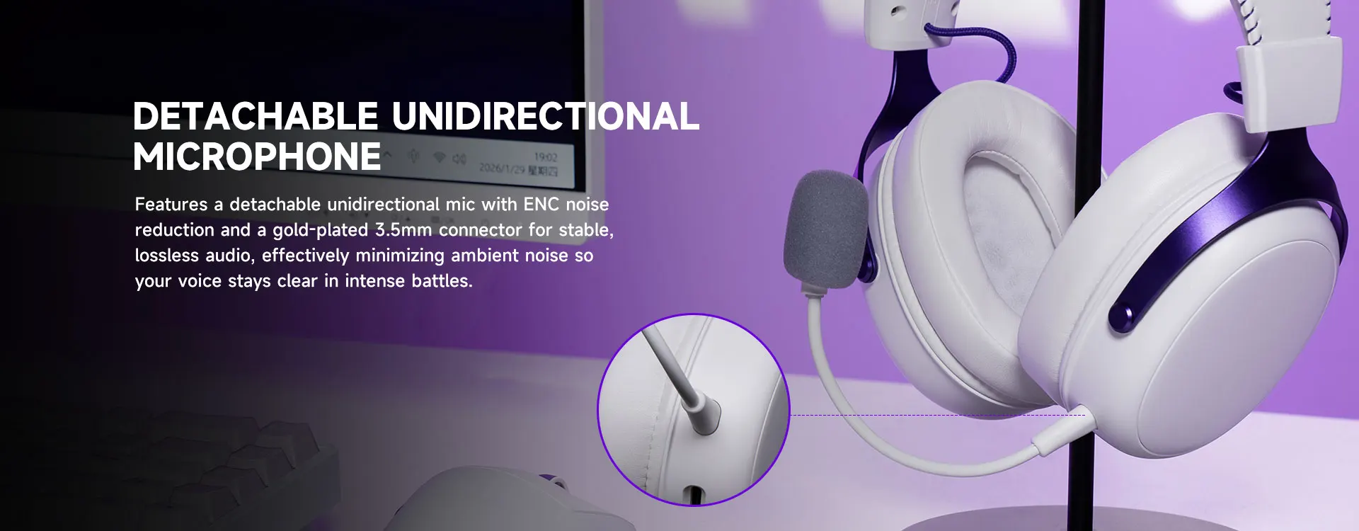 Apresenta um microfone unidirecional removível com redução de ruído ENC e um conector de 3,5 mm banhado a ouro para áudio estável e sem perdas, minimizando efetivamente o ruído ambiente para que sua voz permaneça nítida em batalhas intensas.