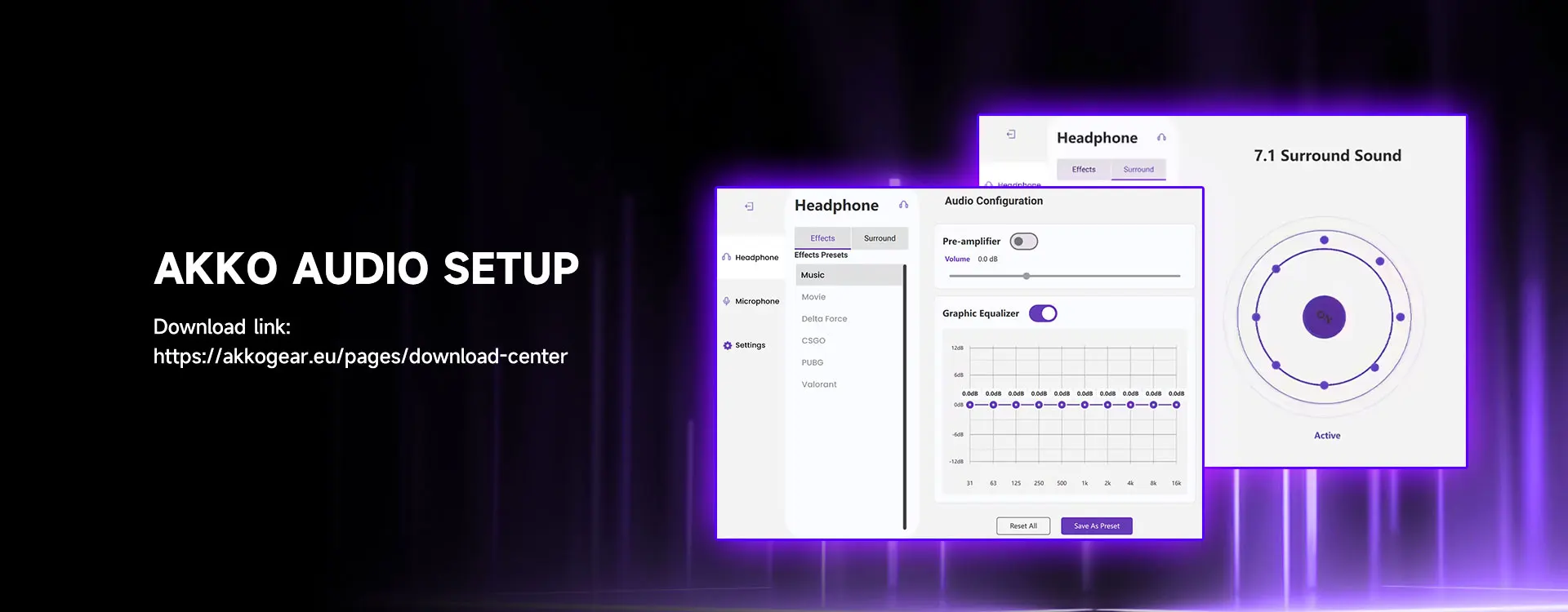 Leve sua vantagem competitiva ainda mais adiante com predefinições de FPS ajustadas profissionalmente no driver — cada uma otimizada com parâmetros de áudio posicional dedicados para Valorant, CS:GO, Delta Force e PUBG. Cada jogo apresenta seu próprio perfil de EQ calibrado para detecção de passos e precisão direcional, oferecendo pistas espaciais precisas em tempo real em cenários de combate complexos.