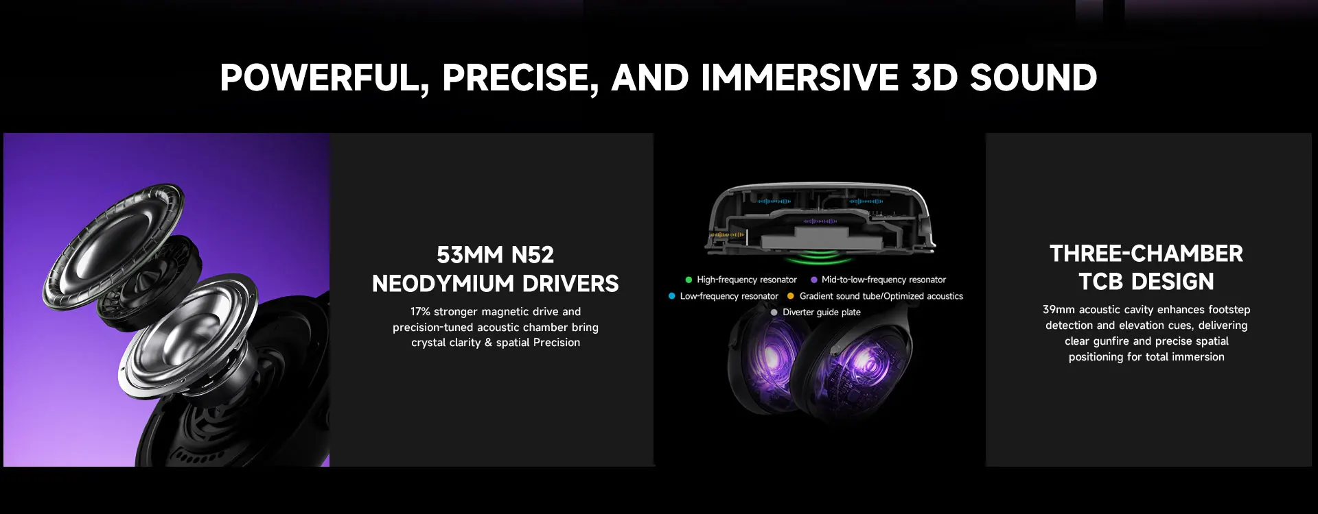 Com um volume de cavidade de 39 mm, este fone de ouvido compacto aprimora a detecção de passos e os estímulos espaciais, distinguindo com precisão paredes e elevações.