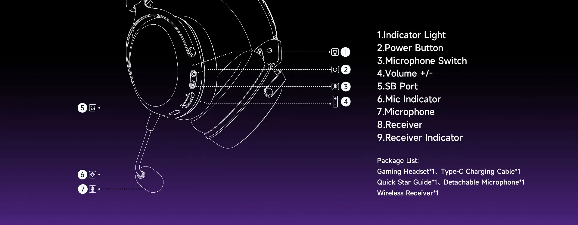 Package Contents: Gaming Headphones, Long Microphone Cable, Type-C Cable, Receiver, Quick Start Guide