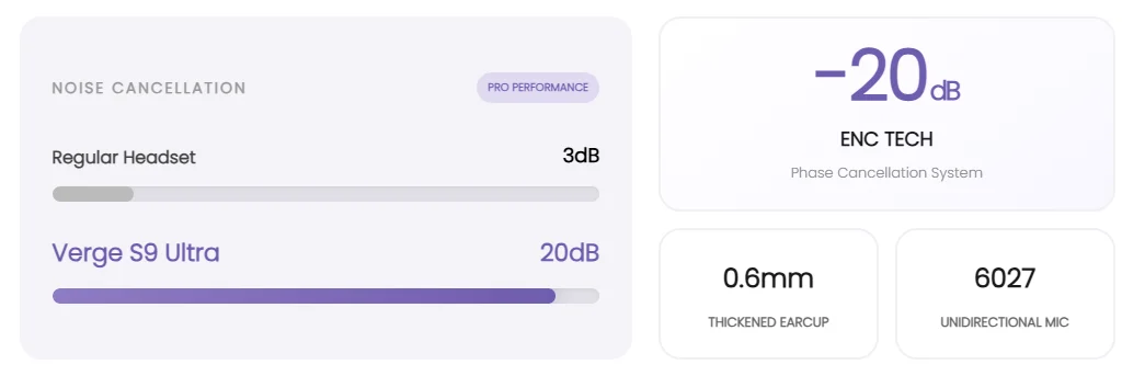 Reduz o ruído ambiente em aproximadamente 20dB, tornando as vozes mais claras mesmo em ambientes ruidosos.