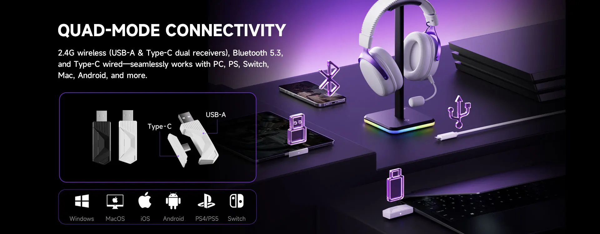 Conectividade Quad-Mode: 2.4G, Bluetooth, Type-C e USB-A