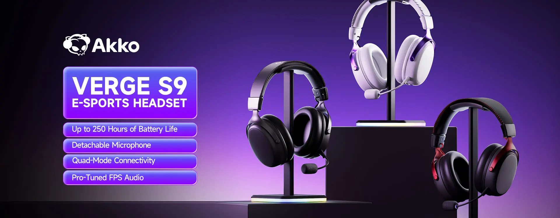 - > Fone de Ouvido AKKO Verge S9 para E-Sports com Microfone, Headphone Gamer Quad-Mode, Áudio Surround 7.1 Canais, Áudio FPS Otimizado, Driver de 53mm