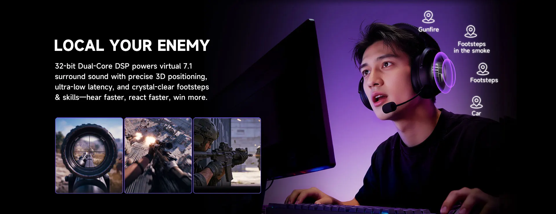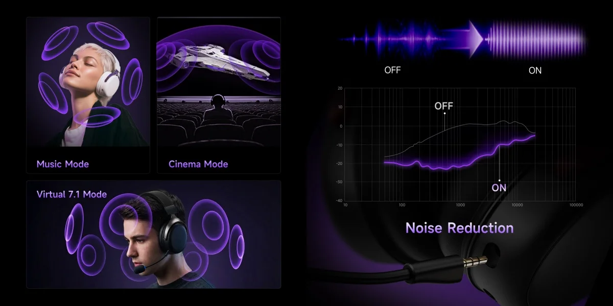 Um DSP Hi-Fi dual-core de nível profissional alimenta o som surround virtual 7.1 com posicionamento 3D preciso. A latência ultrabaixa garante resposta de áudio em tempo real, enquanto a redução de ruído avançada proporciona comunicação de equipe clara — ouça mais rápido, reaja mais rápido, vença mais.