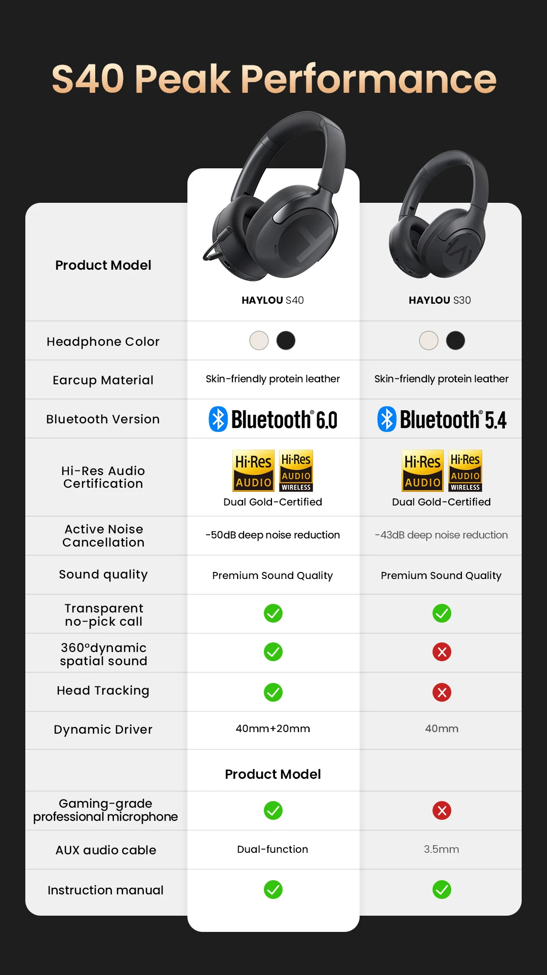 - > Fone de Ouvido Sem Fio HAYLOU S40 ANC com Cancelamento de Ruído de 50dB, Áudio Espacial 3D de Alta Resolução, Fone de Ouvido Bluetooth 6.0 Over Ear