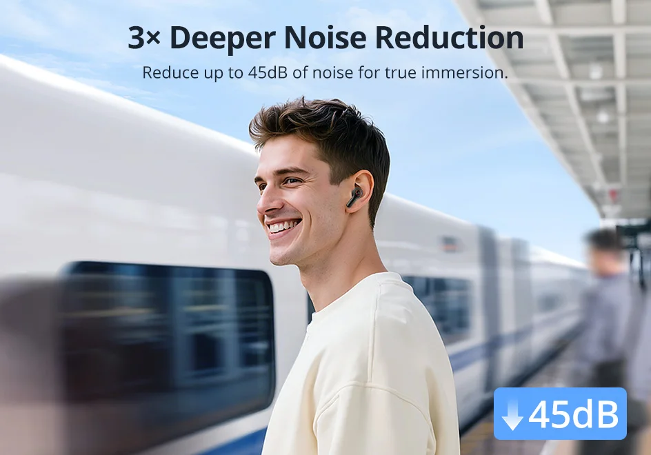 Mergulhe em uma redução de ruído 3 vezes mais profunda, eliminando distrações com 45dB de silêncio puro para foco total.