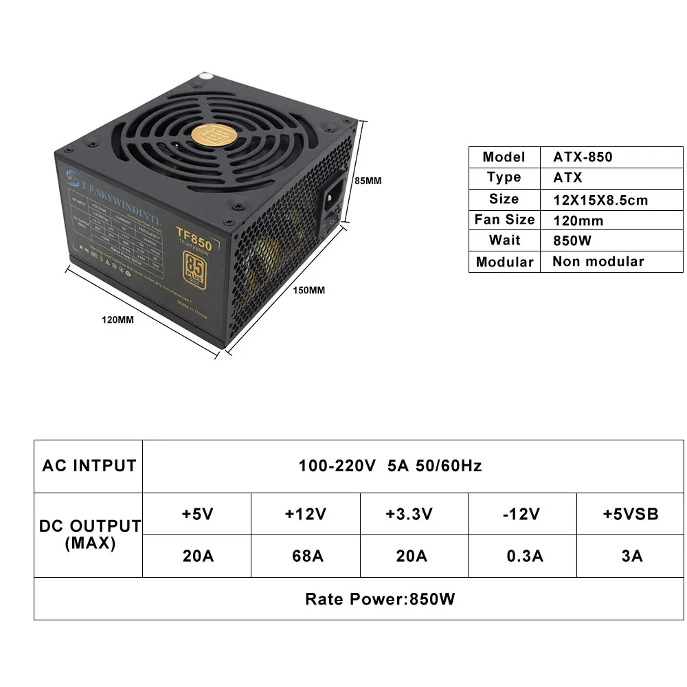 - > Fonte de alimentação 850W 80 Plus Gold PSU Padrão 120mm Ventilador silencioso Fonte de alimentação de computador ATX não modular para servidor de PC de jogos de mesa