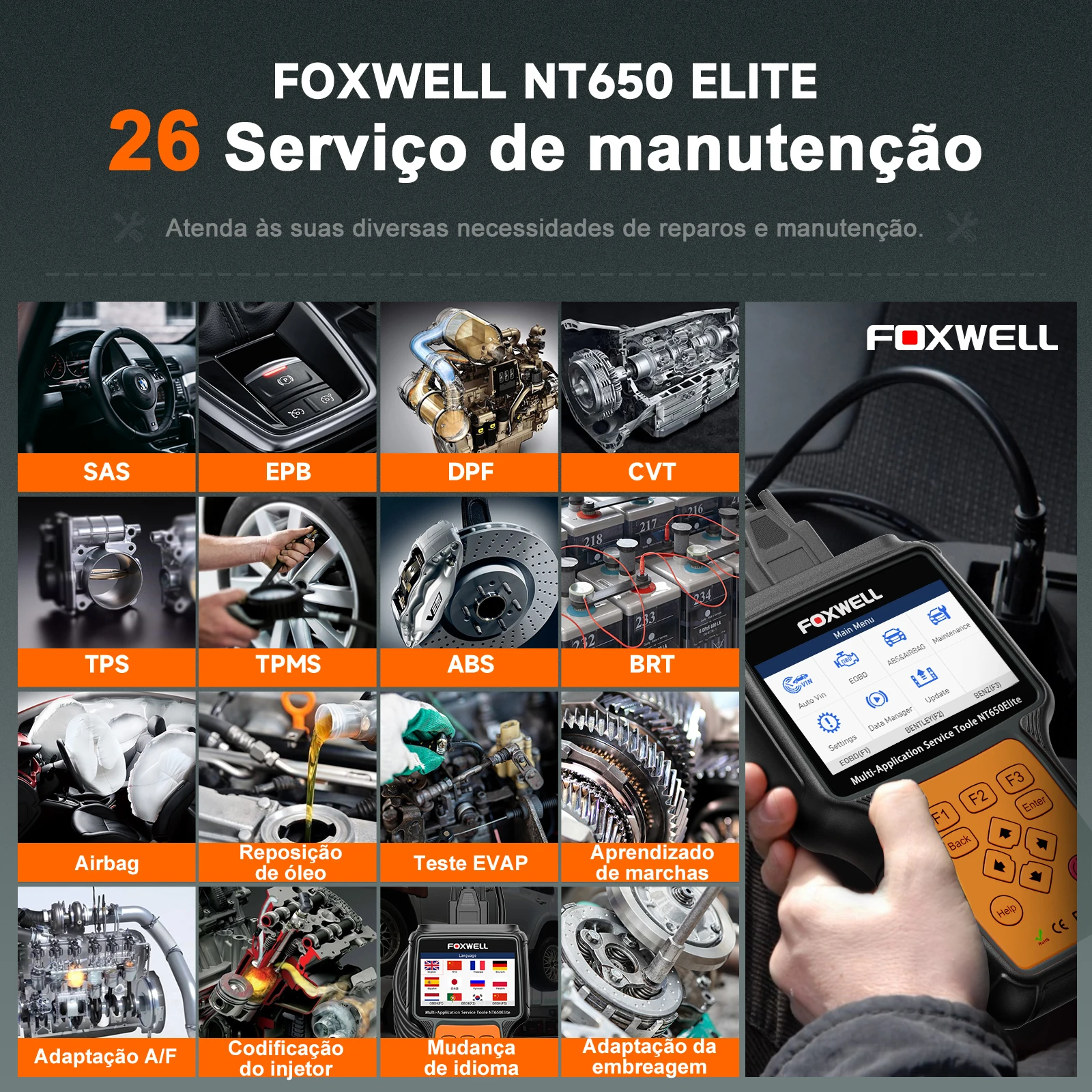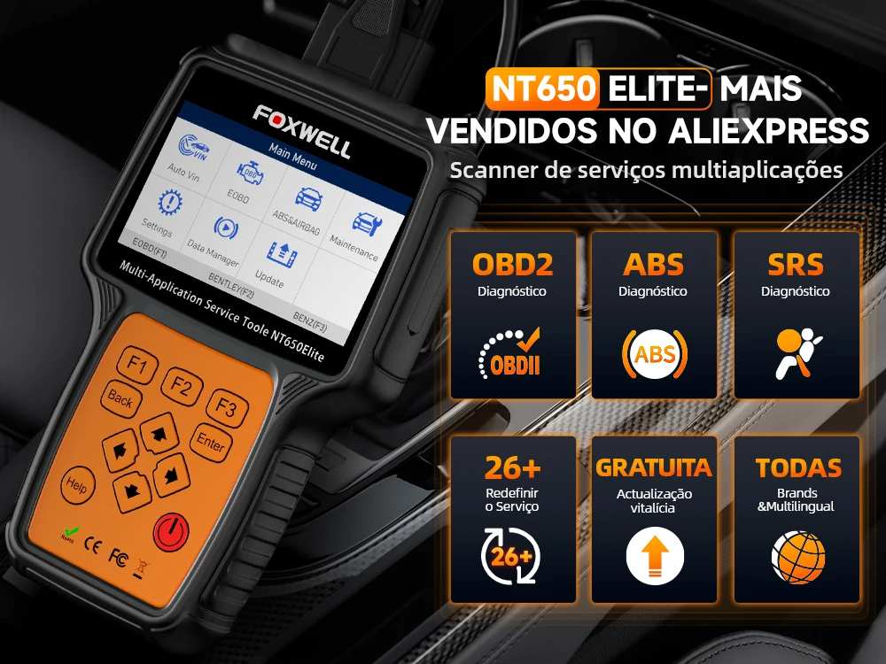 FOXWELL-NT650 Elite OBD2 Scanner Automotivo em Portugues Brasil, A/F Ajustar SAS EPB BRT TPS 26 + Reiniciar, Profissional Auto C