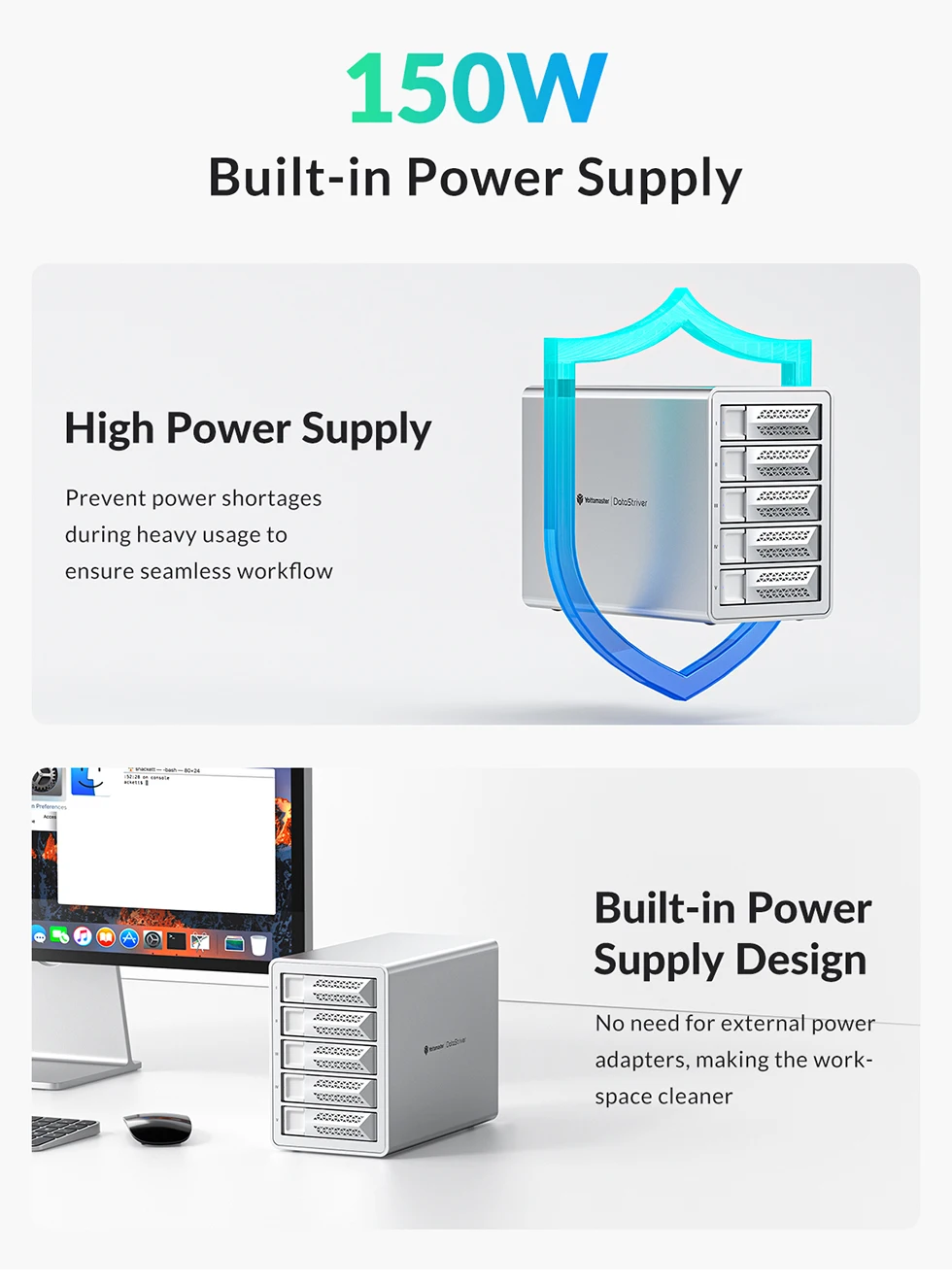 A fonte de alimentação forte pode fornecer saída com potência nominal de 150 W, o que pode garantir a operação estável de discos rígidos quando você inserir cinco HDDs de 22 TB no gabinete.