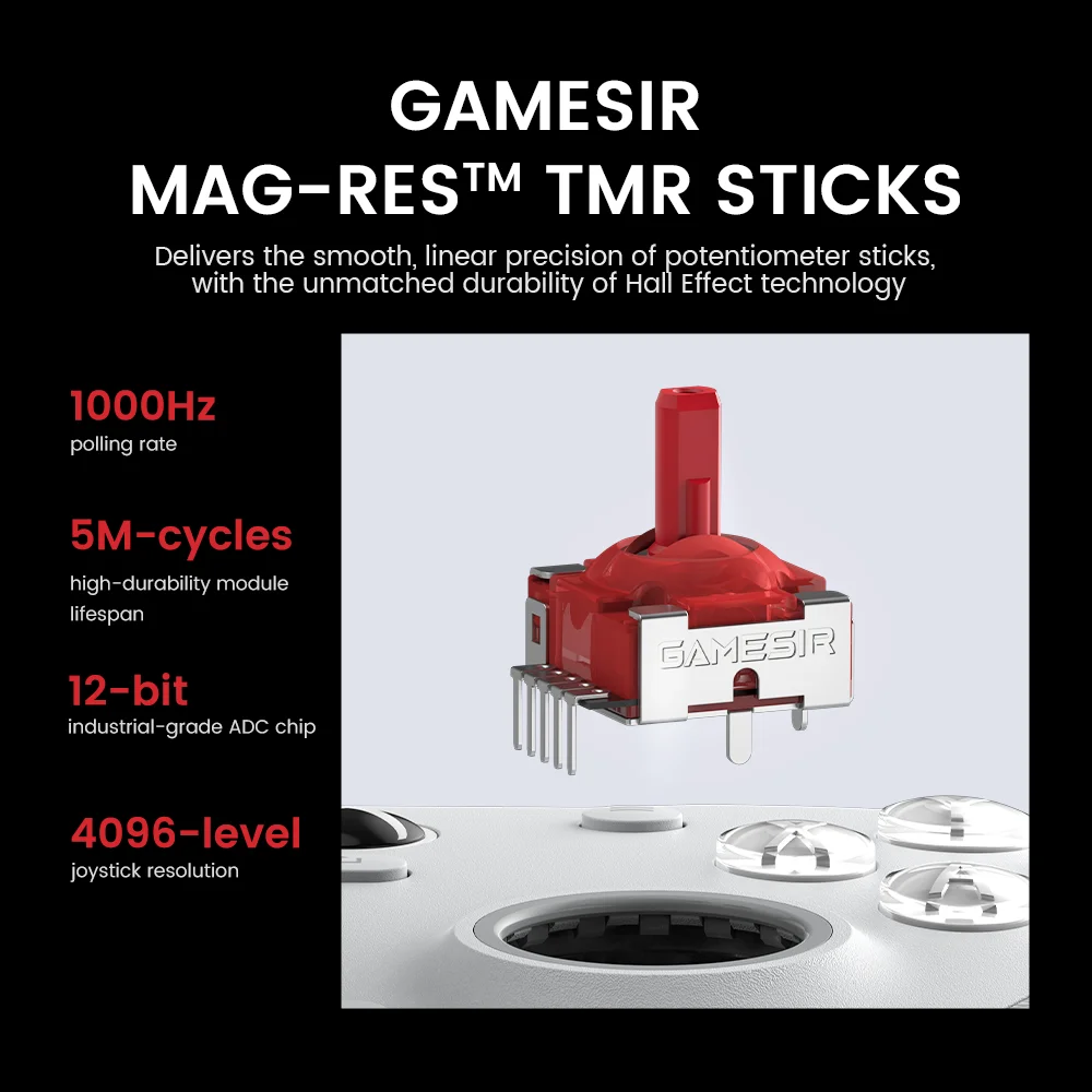 GameSir Mag-Res™ Bastões TMR, controle suave e vida útil ultralonga.
