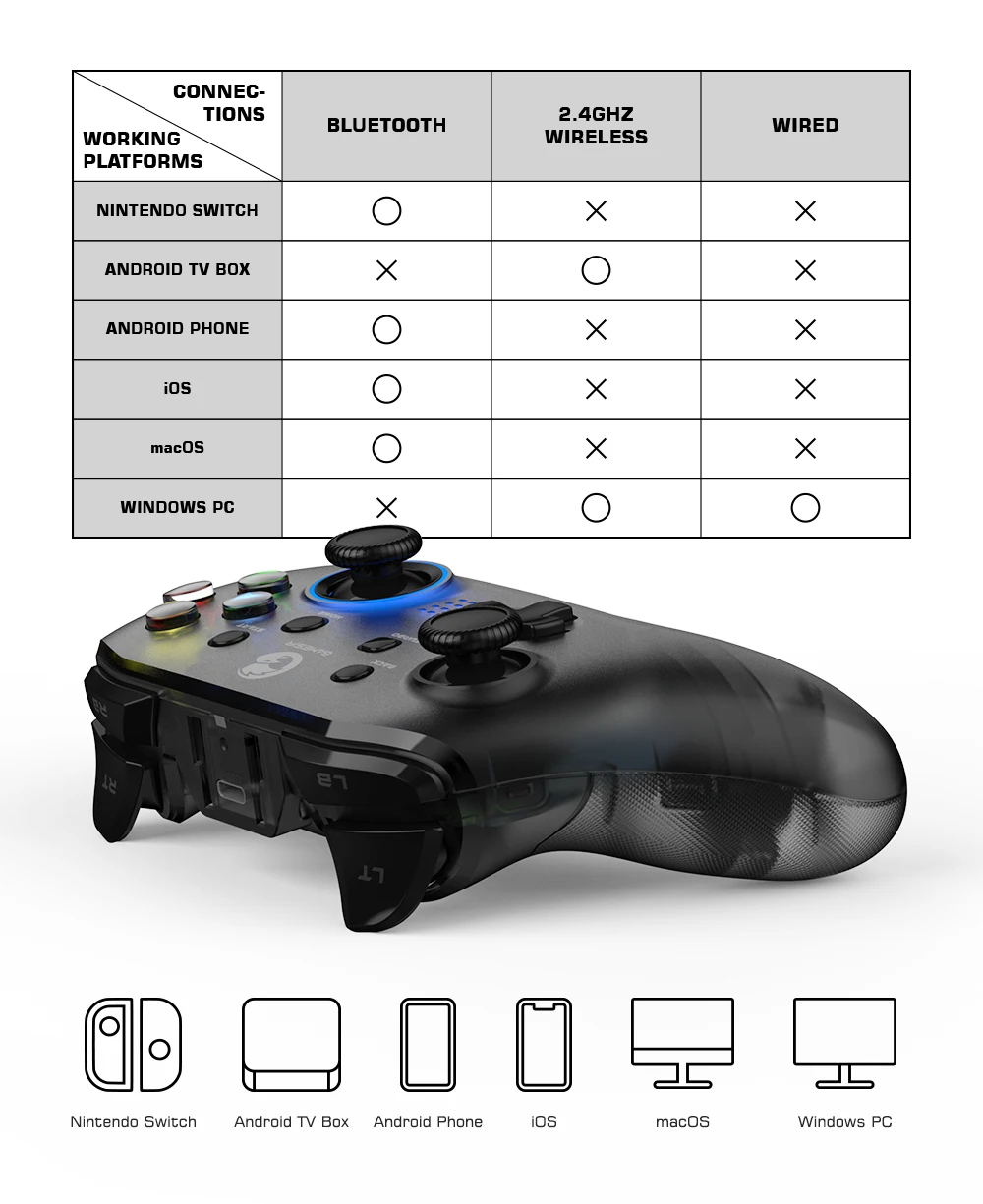 GameSir T4 Pro é um controlador de jogo sem precedentes que suporta quase todas as plataformas de jogos, incluindo Nintendo Switch, Android, iOS, macOS e Windows PC. Atenda às necessidades de muitos jogadores em várias plataformas.