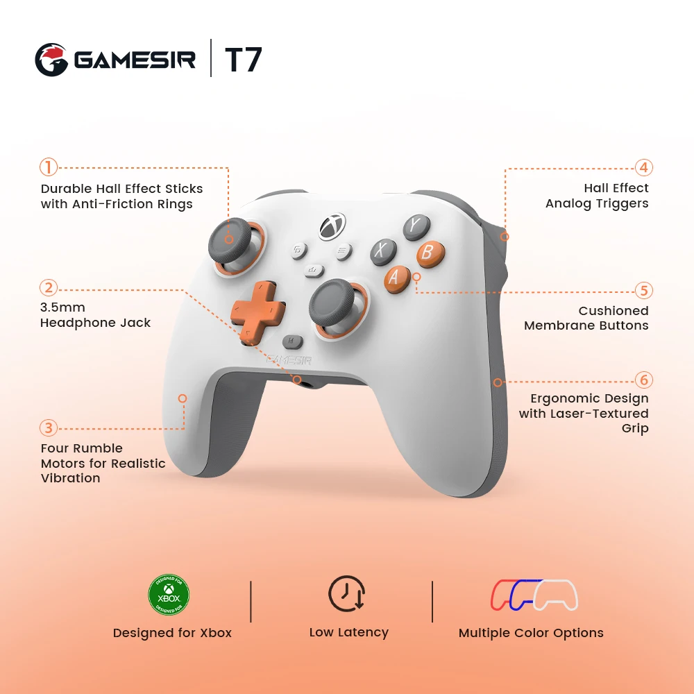 Funciona com Xbox Series X|S, Xbox One e Windows 10/11, o gamepad GameSir T7 oferece a experiência de jogo mais suave e definitiva com menos latência e sem ansiedade de bateria fraca.