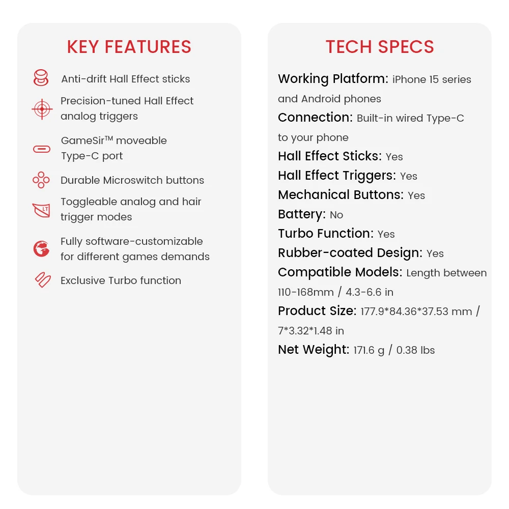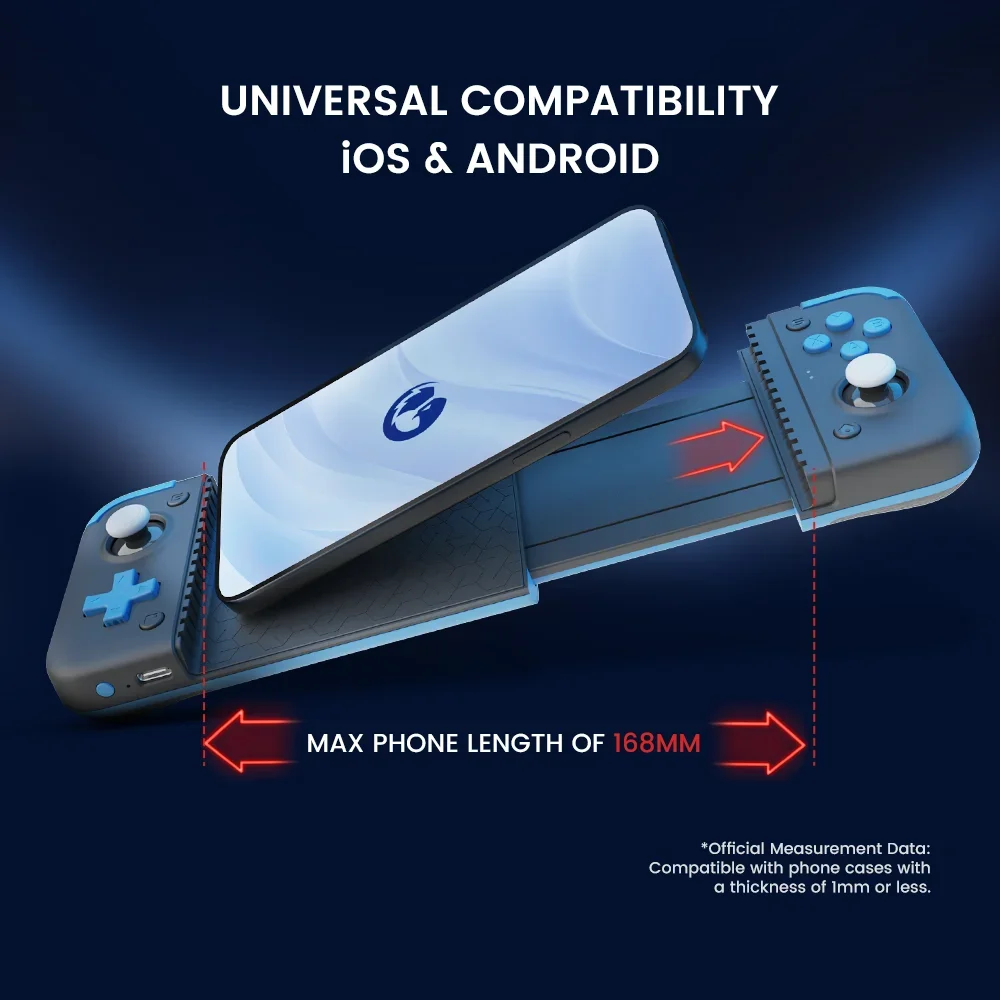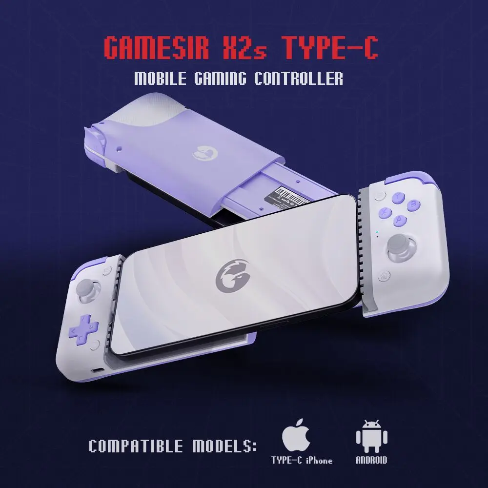 Projetado para funcionar perfeitamente com a série iPhone 15, telefones Android e HarmonyOS, o GameSir X2s Type-C garante compatibilidade universal com uma ampla gama de dispositivos. A compatibilidade aprimorada com módulos de câmera permite que o controle seja compatível com telefones que variam de 110 mm a 168 mm de comprimento, sem restrições de largura.