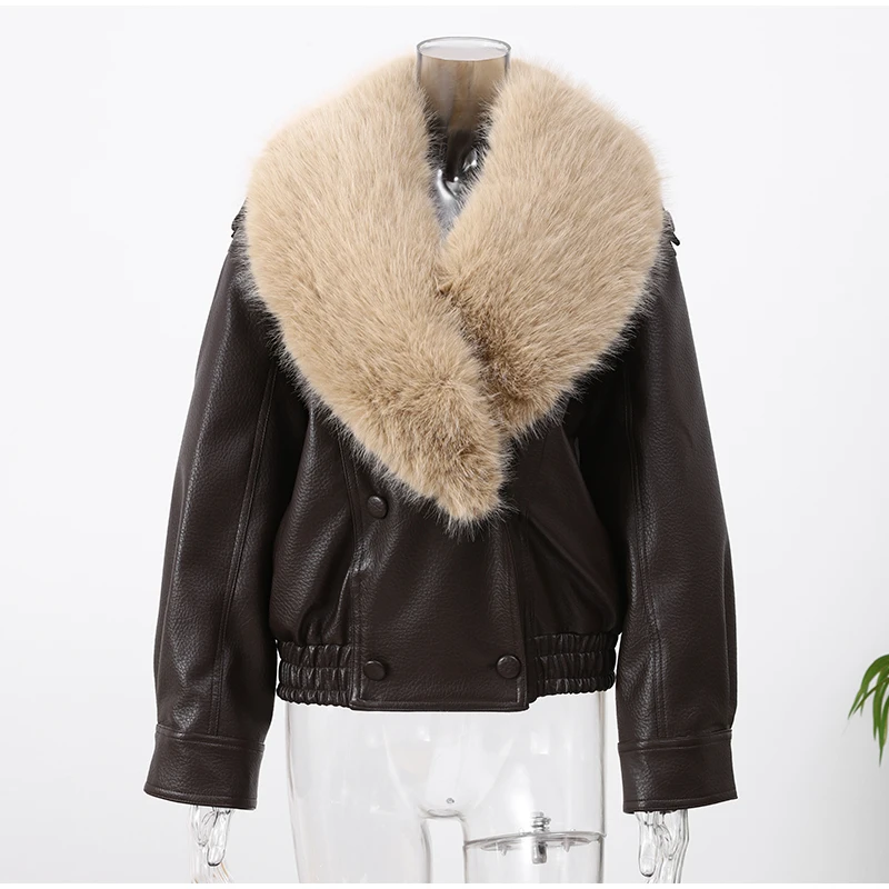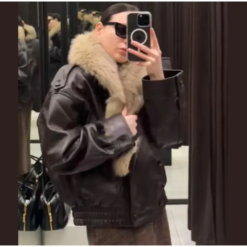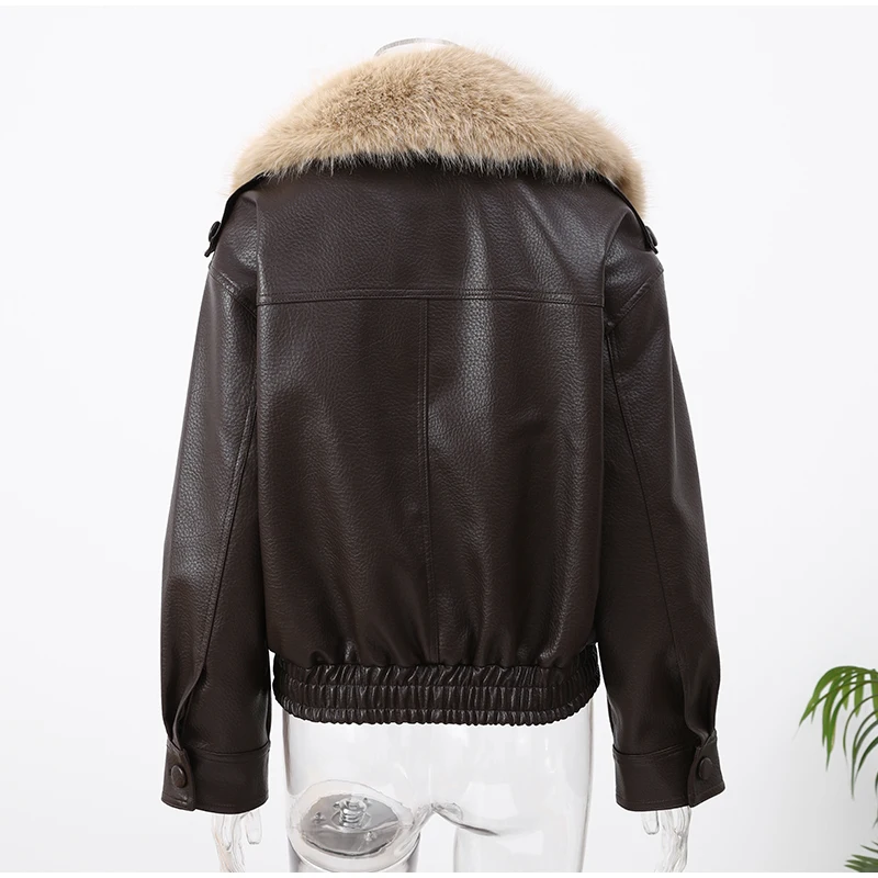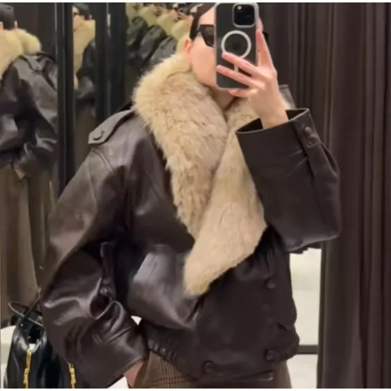Gola de pele do vintage jaqueta de couro feminino lapela com decote em v manga cheia duplo breasted bombardeiro jaquetas senhora inverno alta rua outwear