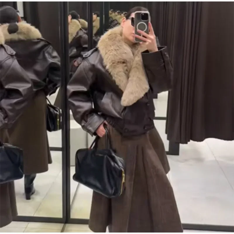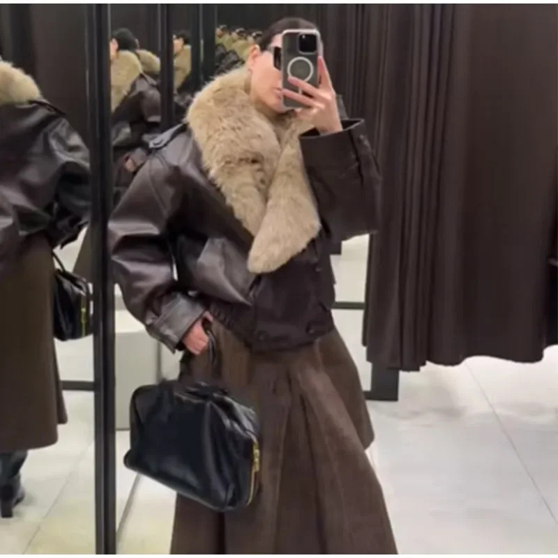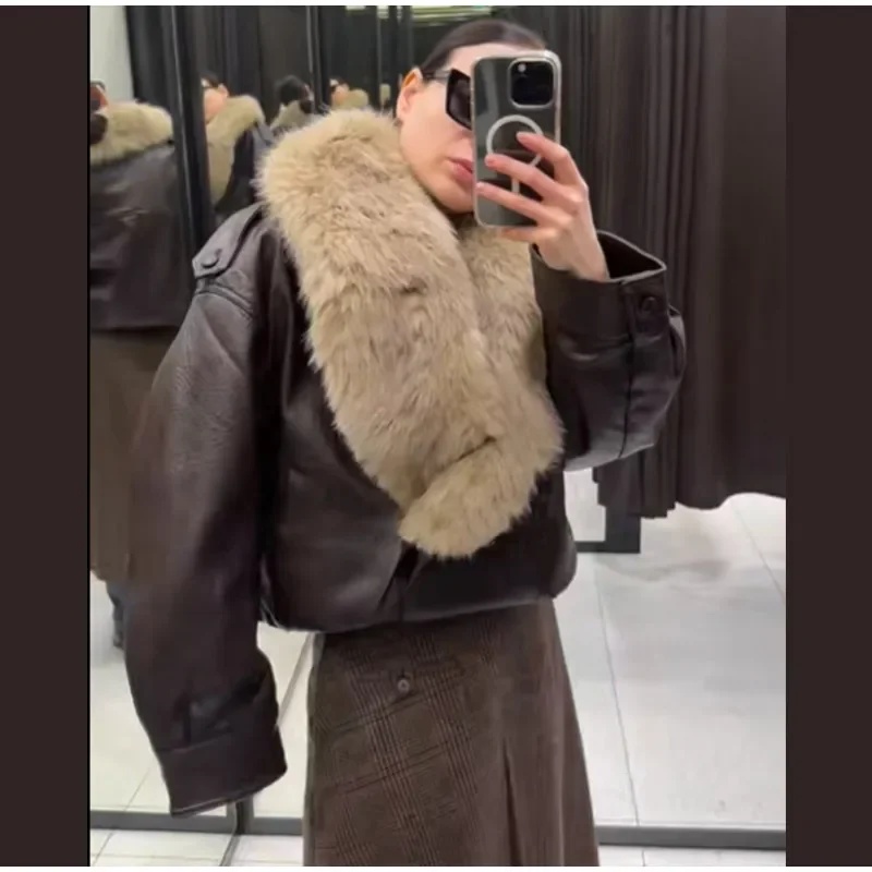 - > Gola de pele do vintage jaqueta de couro feminino lapela com decote em v manga cheia duplo breasted bombardeiro jaquetas senhora inverno alta rua outwear