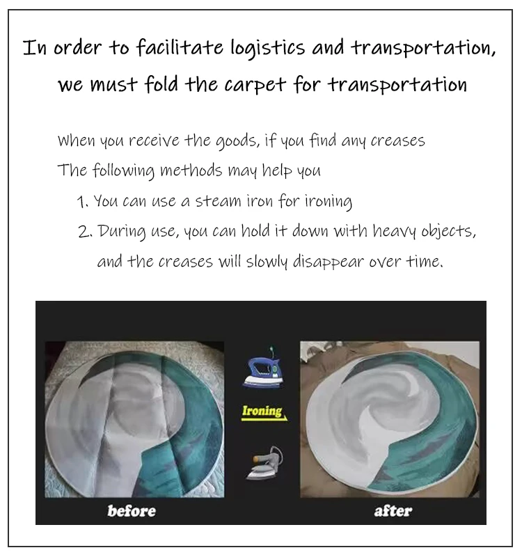 Devido às restrições de envio em alguns países, alguns tapetes precisam ser dobrados e embalados e podem apresentar vincos, o que não é um problema de qualidade.Os vincos desaparecerão com o tempo e também podem ser resolvidos com engomar.Espero que você entenda.