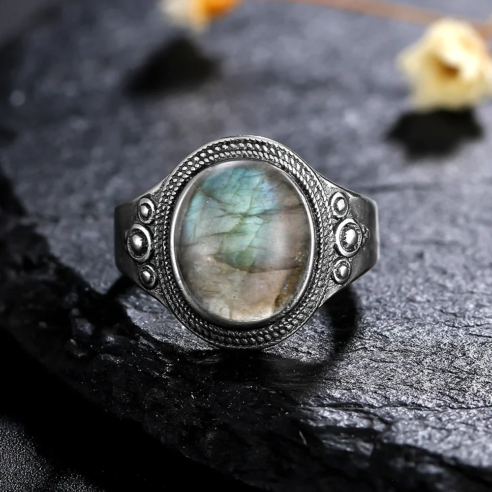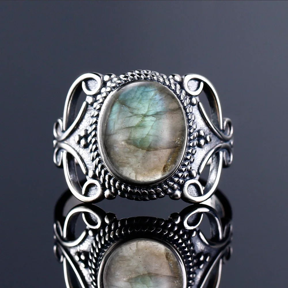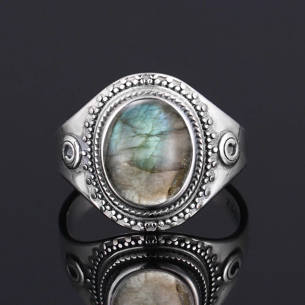 Grande oval redondo natural labradorite anel s925 anel de prata para mulheres em forma de sol retro luxo jóias finas