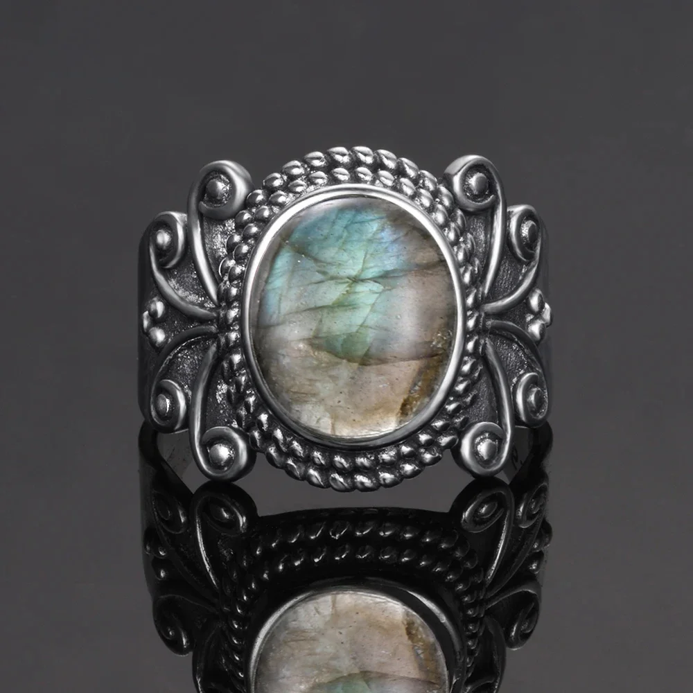 - > Grande oval redondo natural labradorite anel s925 anel de prata para mulheres em forma de sol retro luxo jóias finas