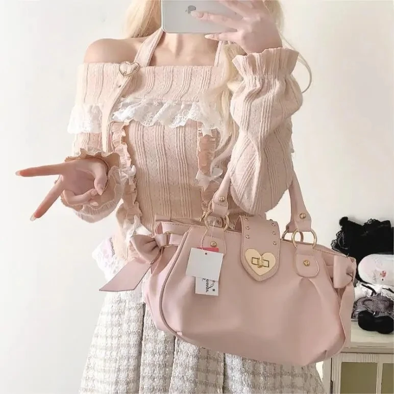 Harajuku arco rosa bolsa de mão feminina estilo japonês macio casual crossbody saco senhoras doce bonito grande capacidade sacos ombro