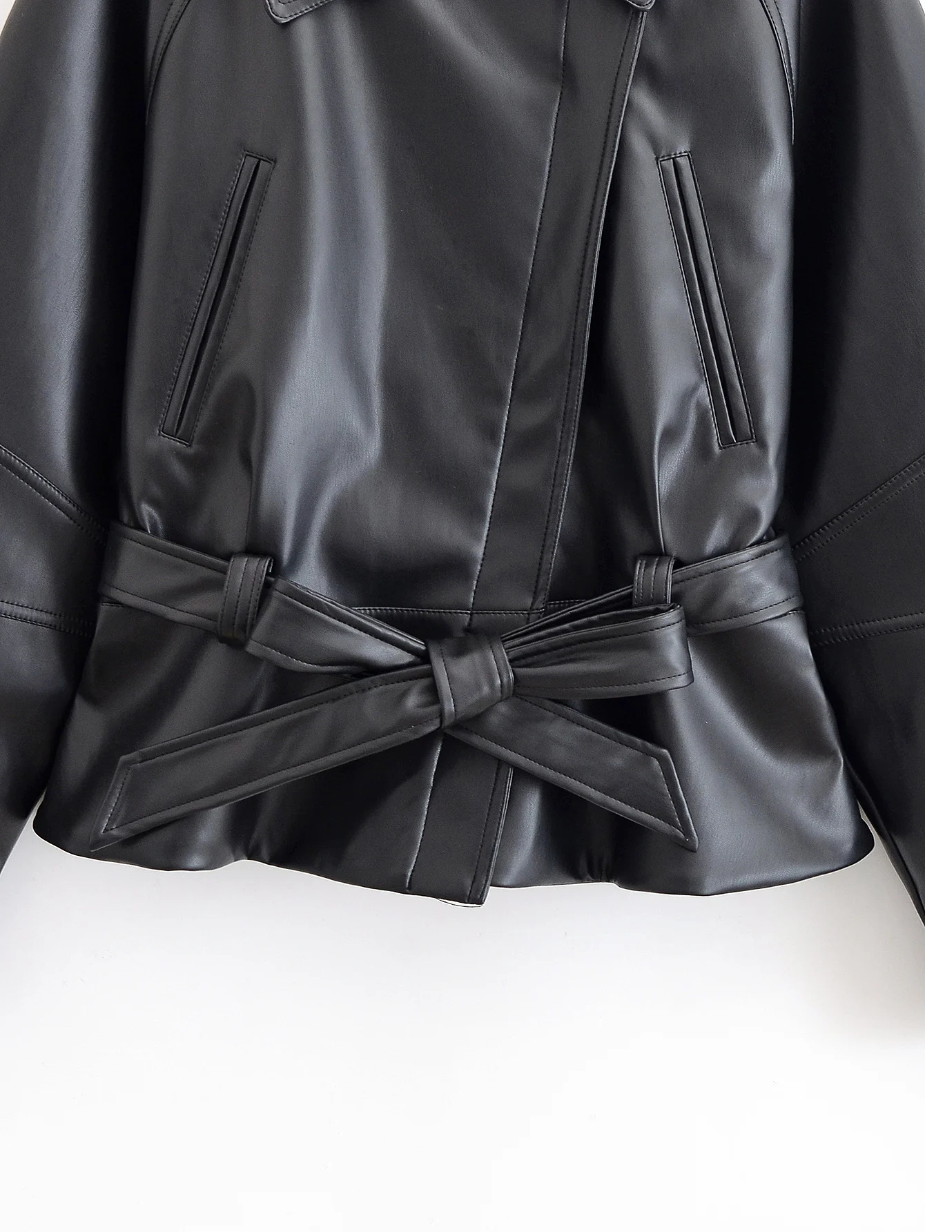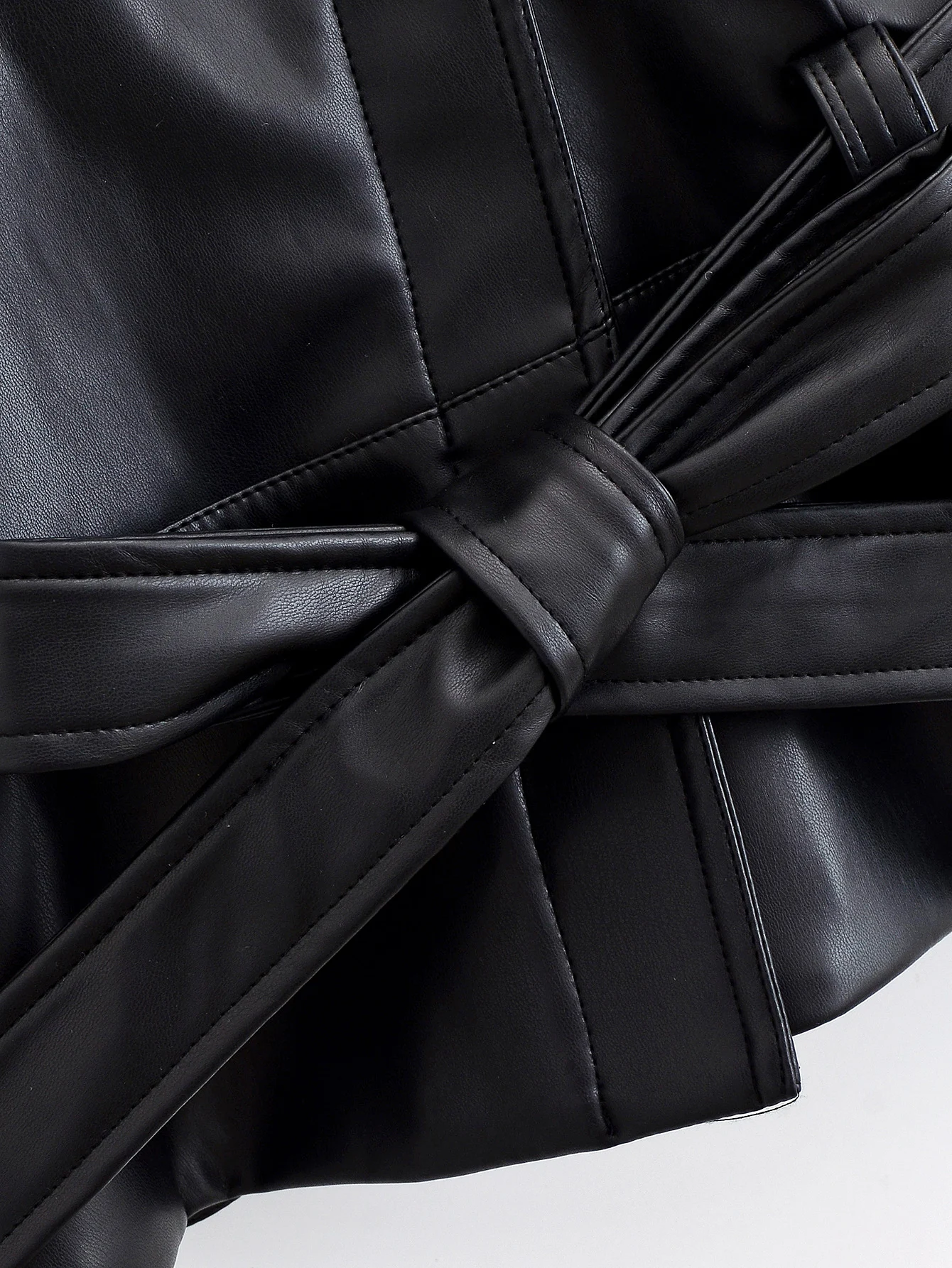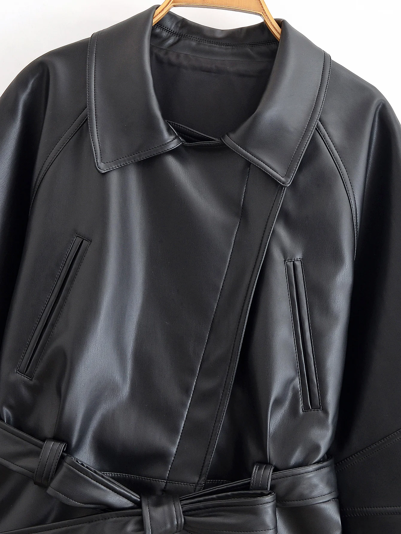 Hh moda feminina preto curto couro falso trench coat manga longa lapela jaqueta com cinto vintage senhora jaqueta de motocicleta outwear