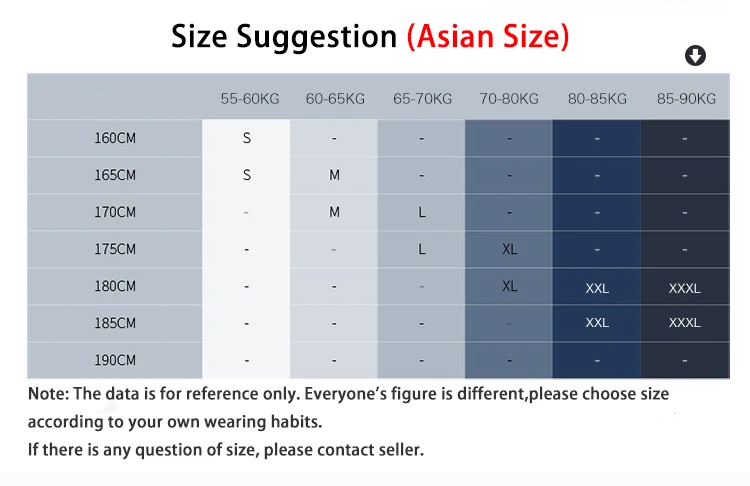 2.Se você não sabe escolher um tamanho adequado, consulte a tabela de tamanhos abaixo com base em sua altura e peso.(Observe que a jaqueta é do tipo justo como mostra o modelo abaixo, se você não gostar de usar muito justa, sugerimos que escolha um tamanho maior.Se você ainda tiver dúvidas sobre a escolha do tamanho, entre em contato com o vendedor.)