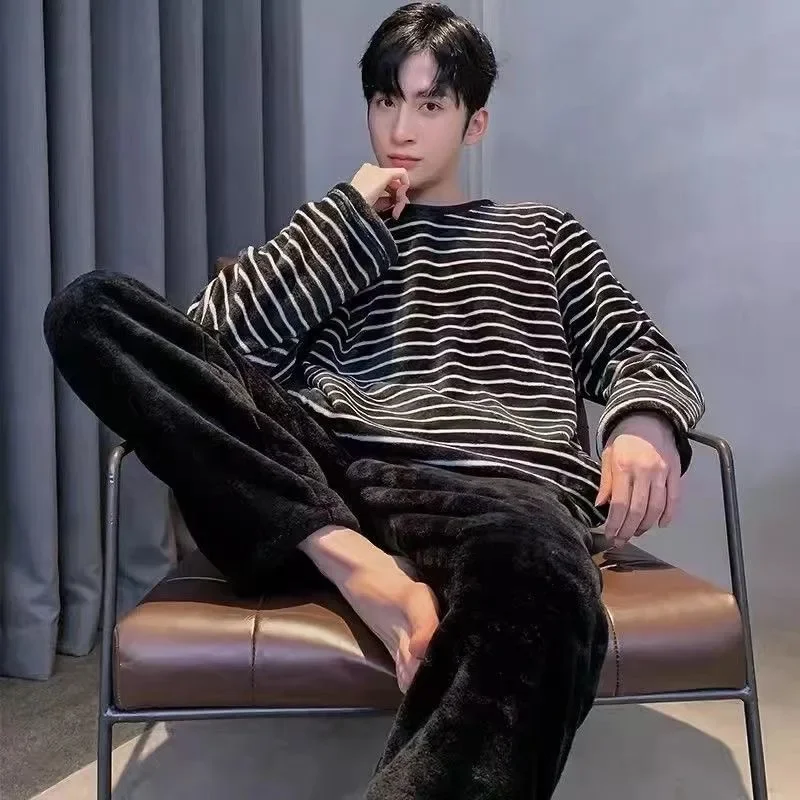 Homens inverno quente flanela conjuntos de pijama manga longa grosso homewear para homens coral veludo bonito dos desenhos animados pijamas terno homewear