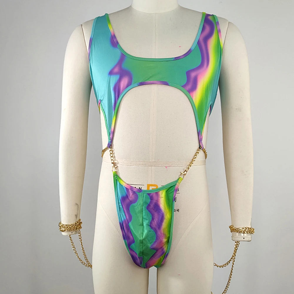 - > Homens Macacão Boate Colorido Impresso Cadeia T Em Forma Macacão Sexy Erótico Lingerie Fetiche Pijamas Bodysuit Siamese Underwear