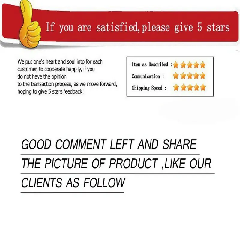 Sua satisfação e feedback positivo são muito importantes para nós. Deixe um comentário positivo e 5 estrelas se estiver satisfeito com nossos itens e serviços. Se você tiver algum problema com nossos itens ou serviços, não hesite em nos contatar antes de deixar um feedback negativo. Faremos o nosso melhor para resolver quaisquer problemas e fornecer-lhe o melhor atendimento ao cliente.