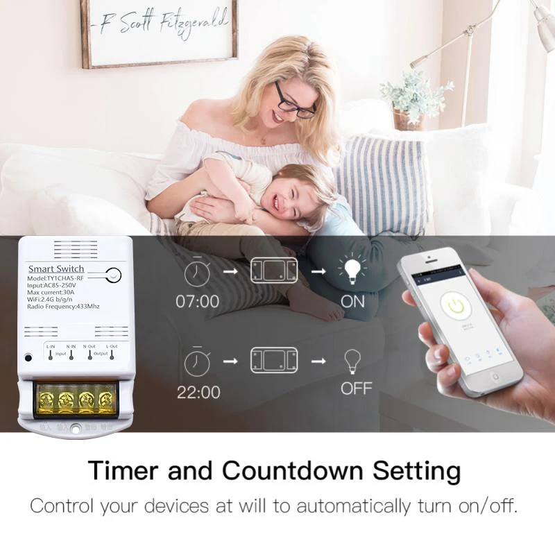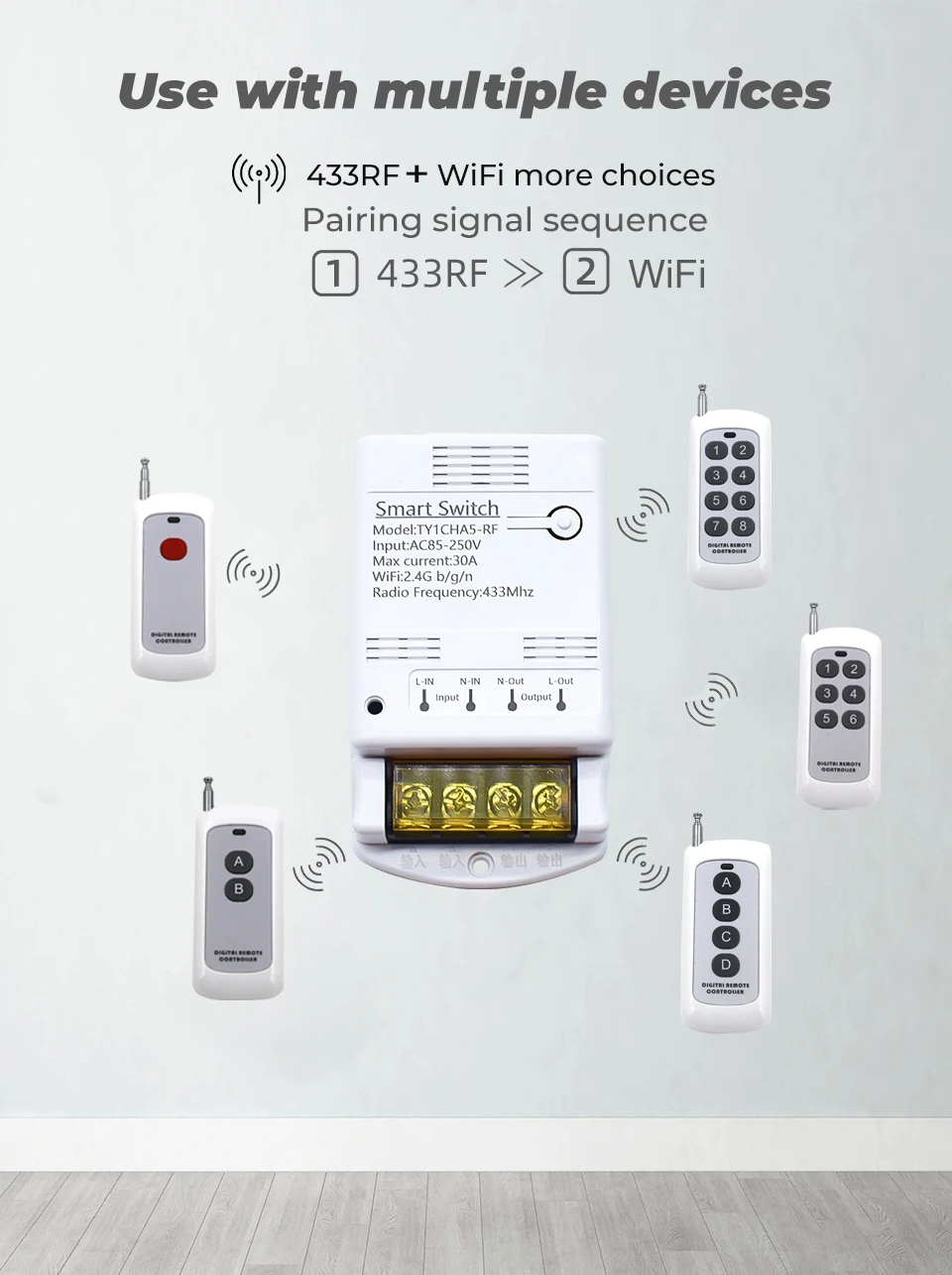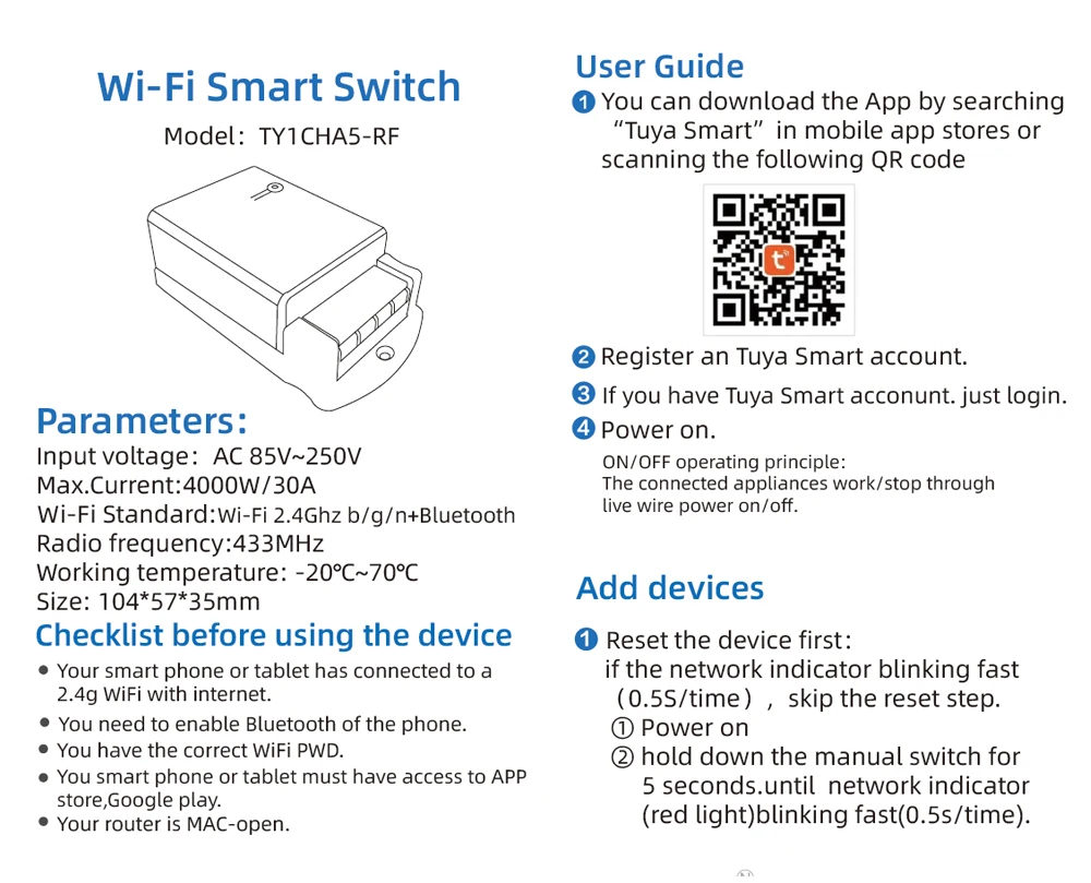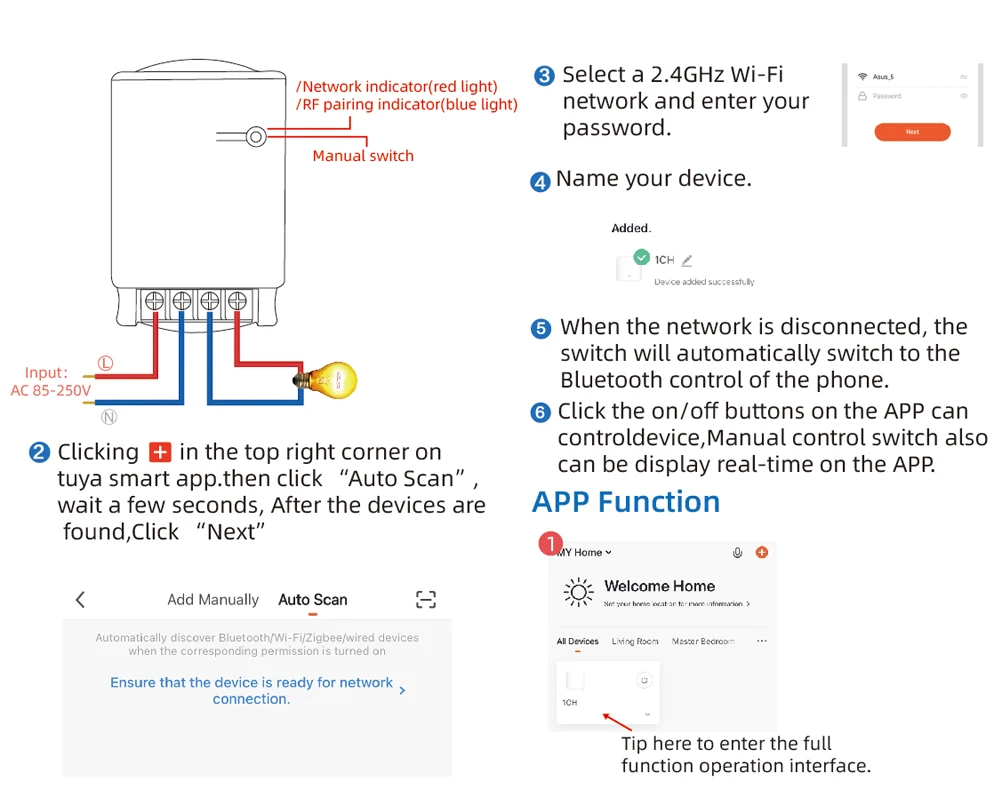 This product is a wireless switch supports inching /self-locking mode. Users can add the device to the APP Smart life in order to remotely control connected home appliances or devices.