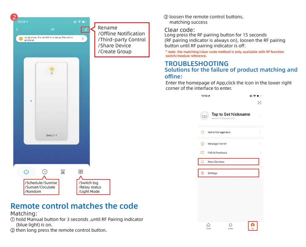3.Press immediately (within 5 seconds) after energizing the switch more Three clicks on the remote control button (need to ptess that with that),the red LED flashes 2 to indicate the success of the remote control learning code .