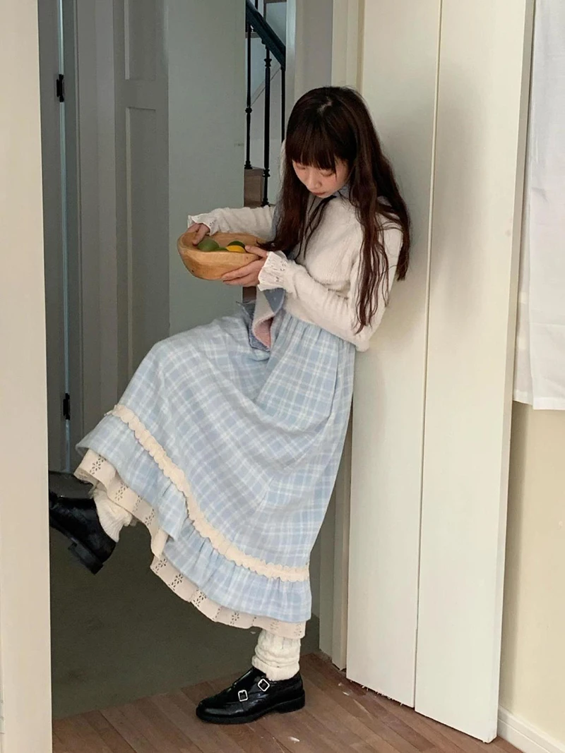 Japonês doce saia longa feminina outono inverno azul xadrez vintage preppy retalhos saias de cintura alta uma linha solta casual bonito saia