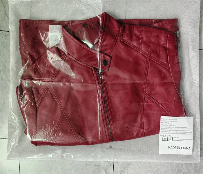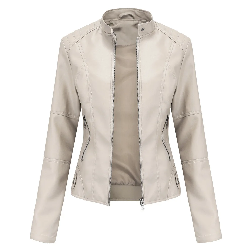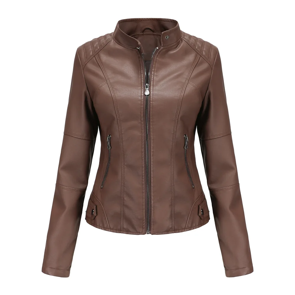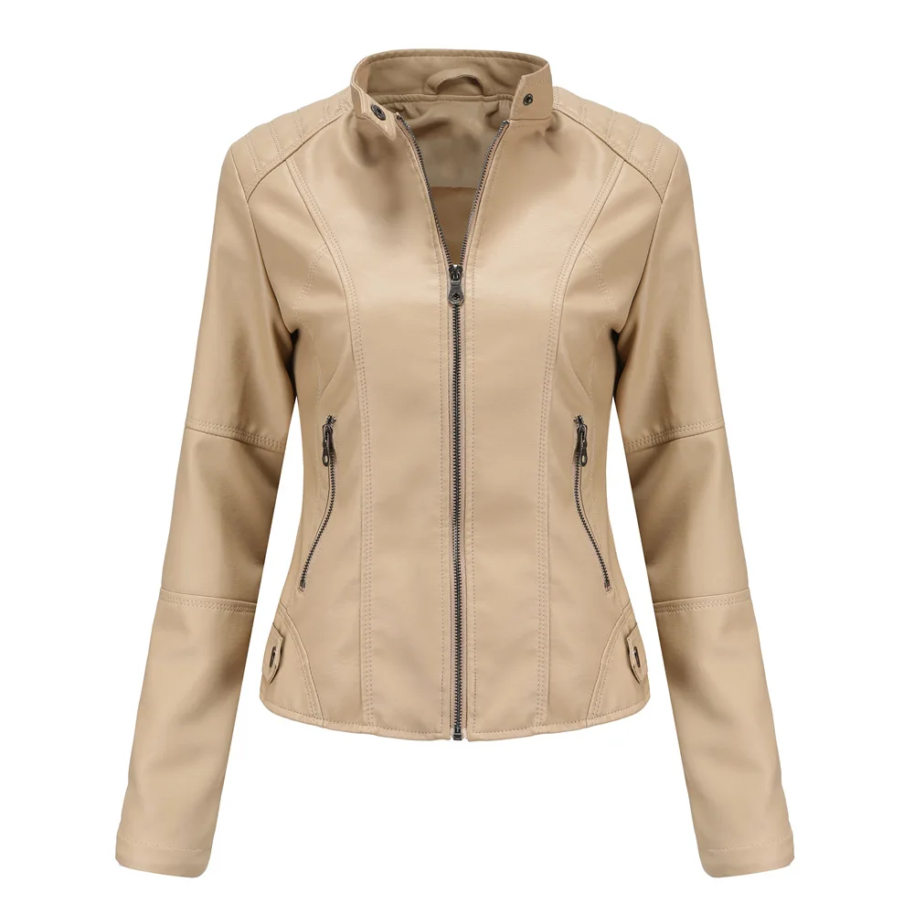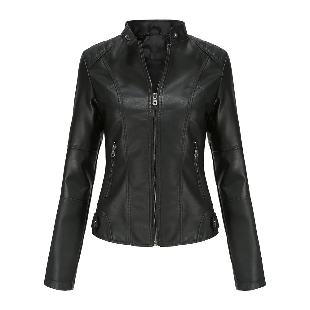 Jaqueta Feminina de Couro Sintético Vermelha de Manga Longa para Primavera, Casaco Preto de PU com Gola Alta, Tamanho Europeu, Disponível em Azul, Bege, Roxo.