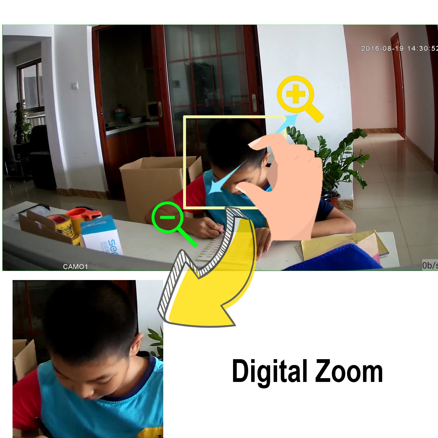 This camera supports Digital Zoom, Press and hold the screen with both hands to Zoom in/out and see more details.