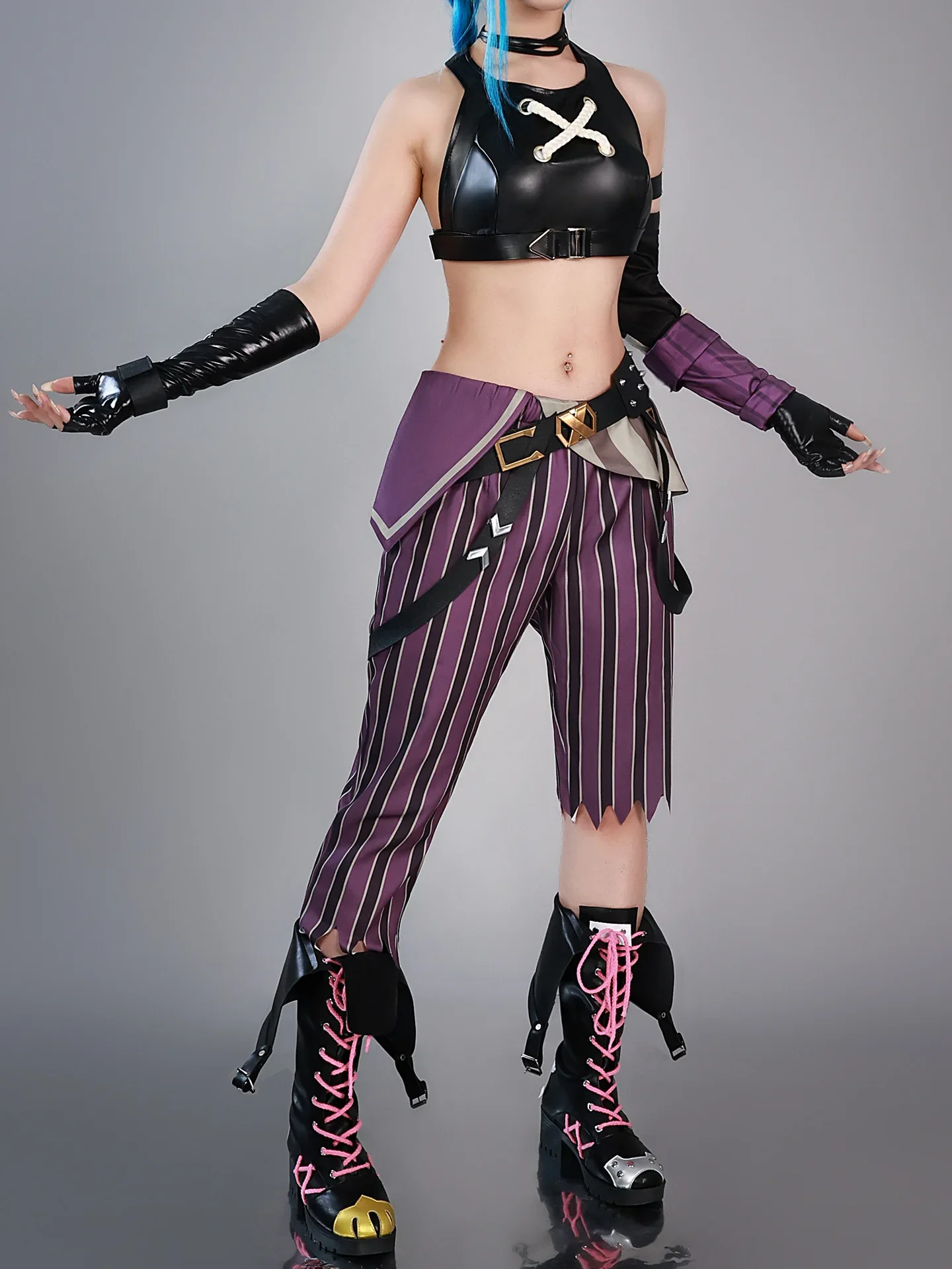 Esta fantasia de cosplay League of Legends Jinx é uma réplica precisa do uniforme de dramatização Arcane do jogo, perfeita para fãs que buscam autenticidade.