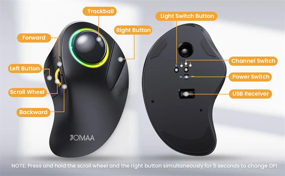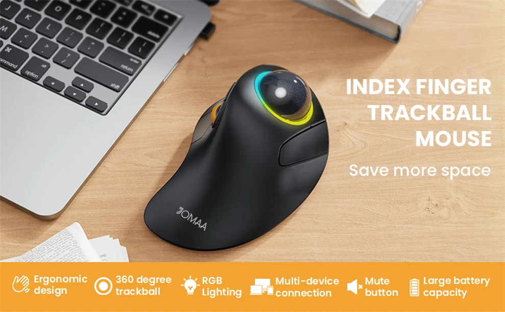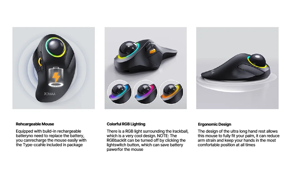 - > Jomaa rgb retroiluminado sem fio trackball mouse sem fio 2.4g recarregável ergonômico rollerball gaming mouse para portátil mac ipad jogo