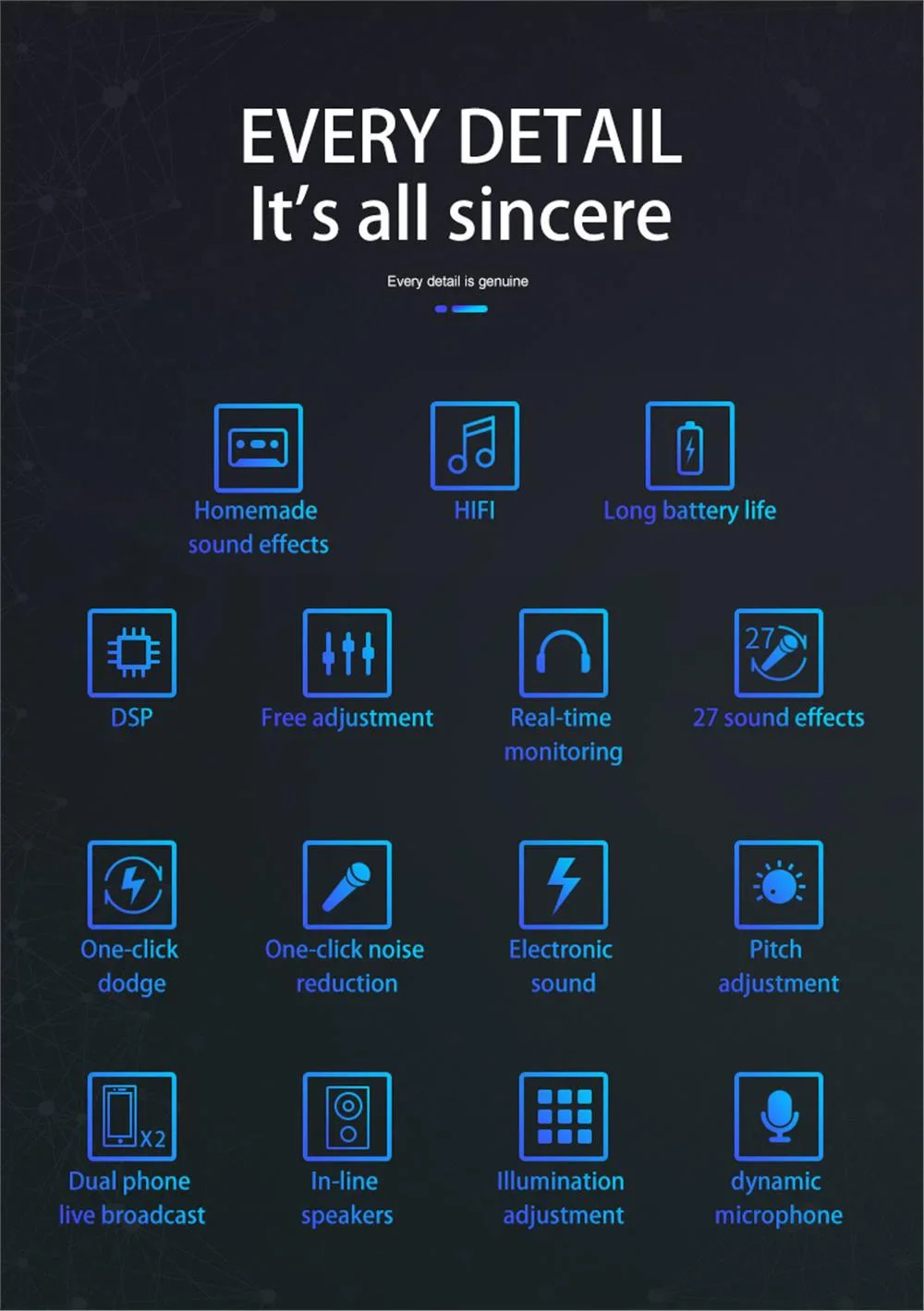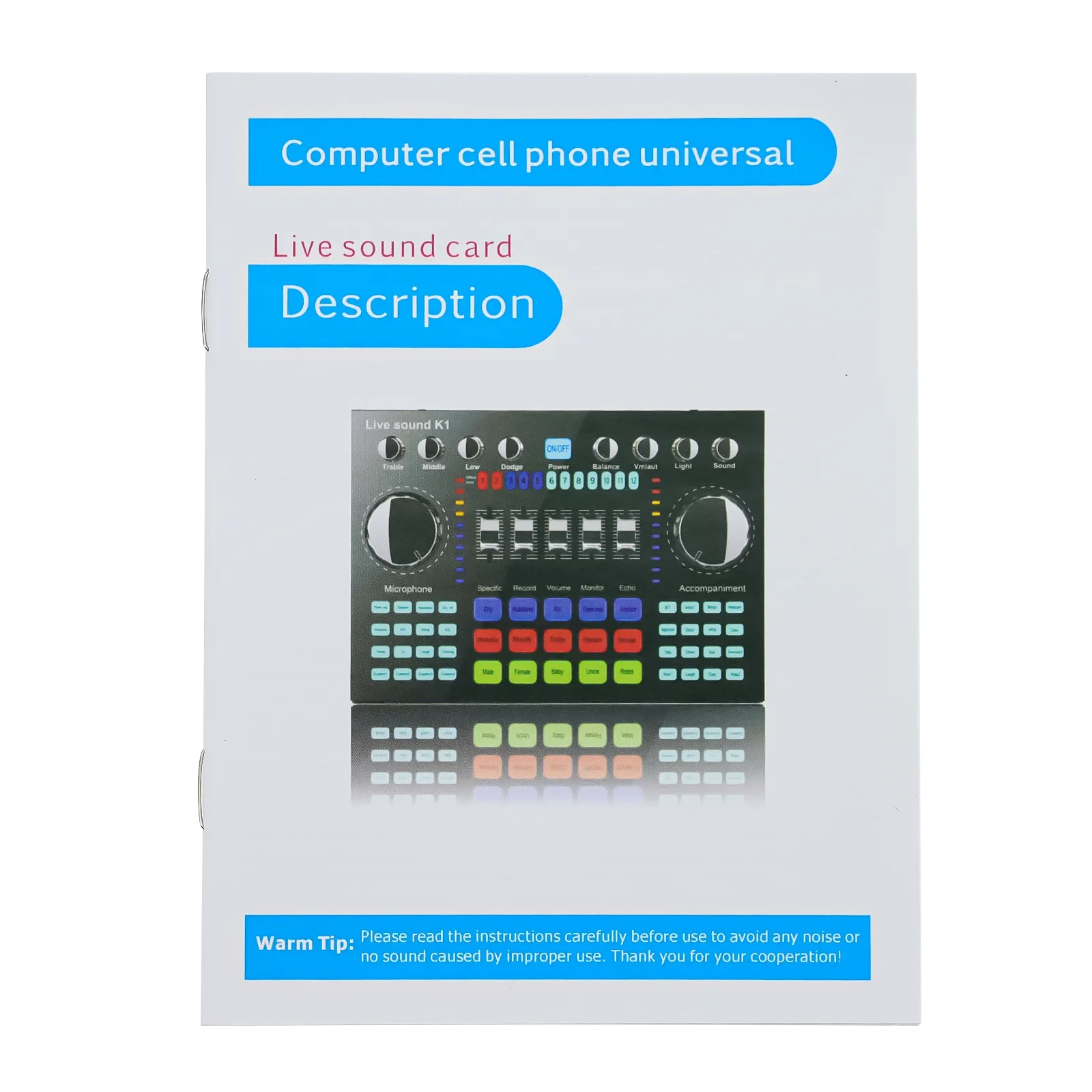 1. ajuste de botão grande, ajuste de fader, 27 tipos de efeitos sonoros, iluminação colorida, transmissão ao vivo de telefone duplo.