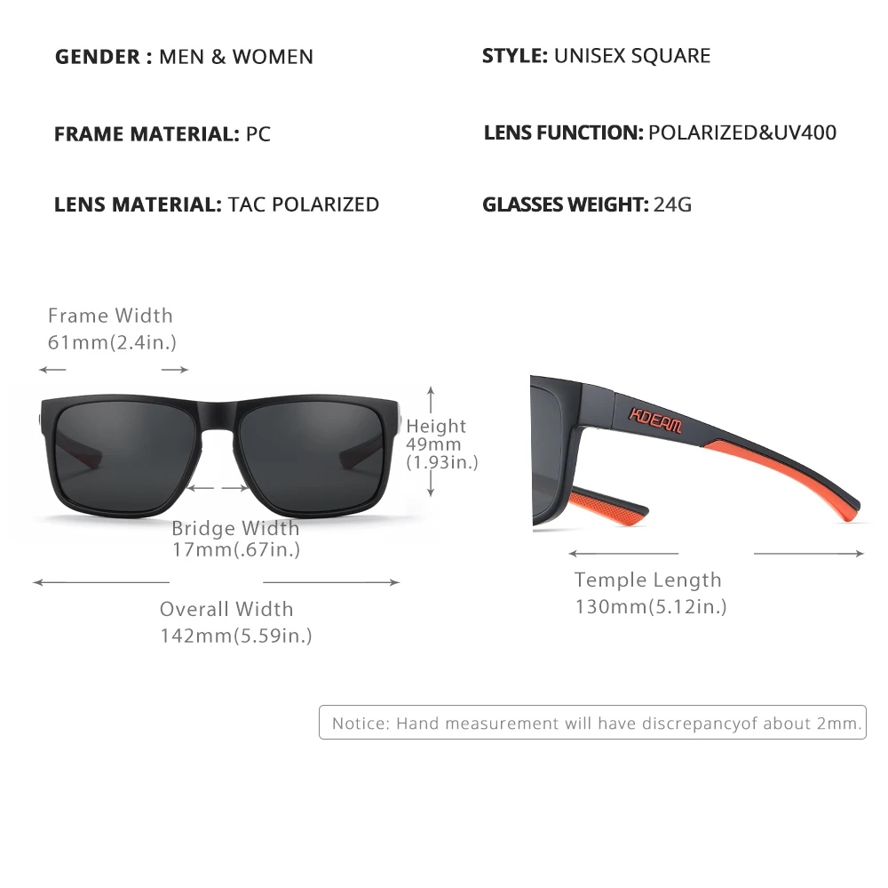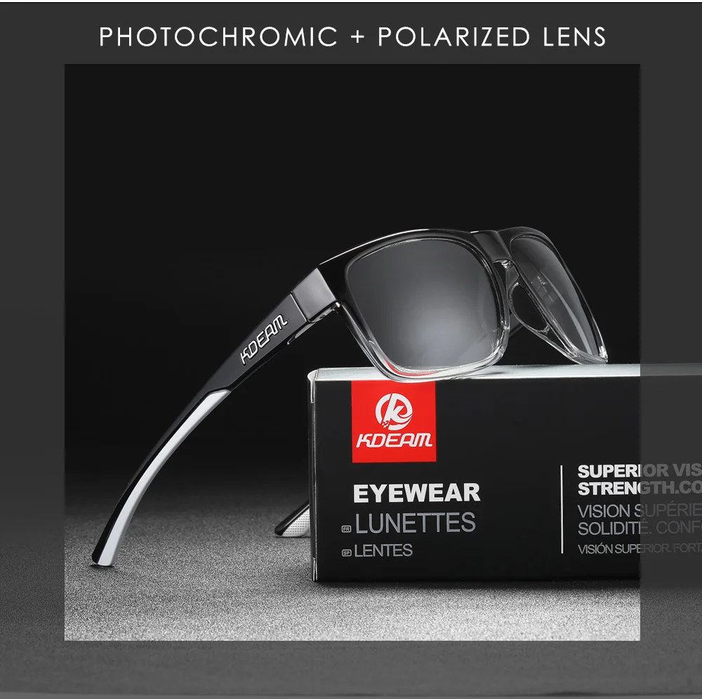 - > KDEAM Novos óculos de sol polarizados masculinos quadrados ao ar livre fotocromáticos óculos de sol feminino antiderrapante almofada de nariz acessórios completos incluídos