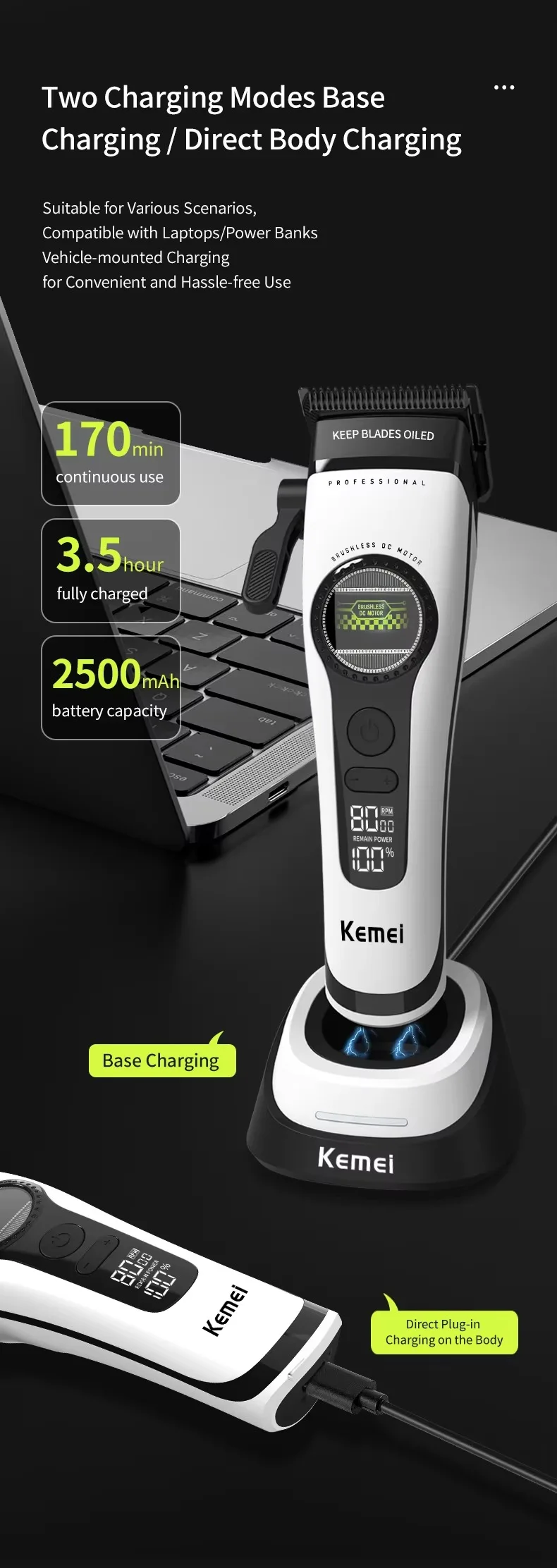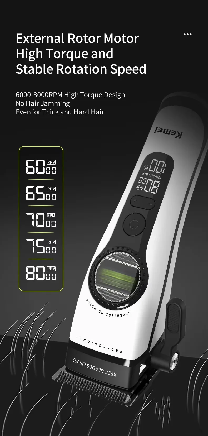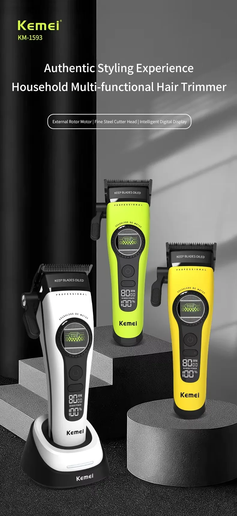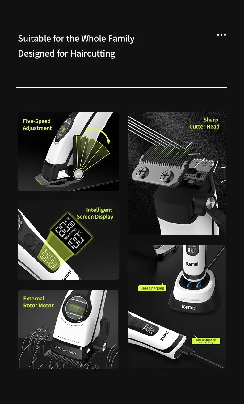 A máquina de cortar cabelo KM - 1593 possui um motor brushless superpotente montado externamente.Reduz o atrito e o desgaste, opera silenciosamente e oferece potência duradoura para lidar com cabelos grossos sem esforço, adequado tanto para profissionais quanto para usuários domésticos.