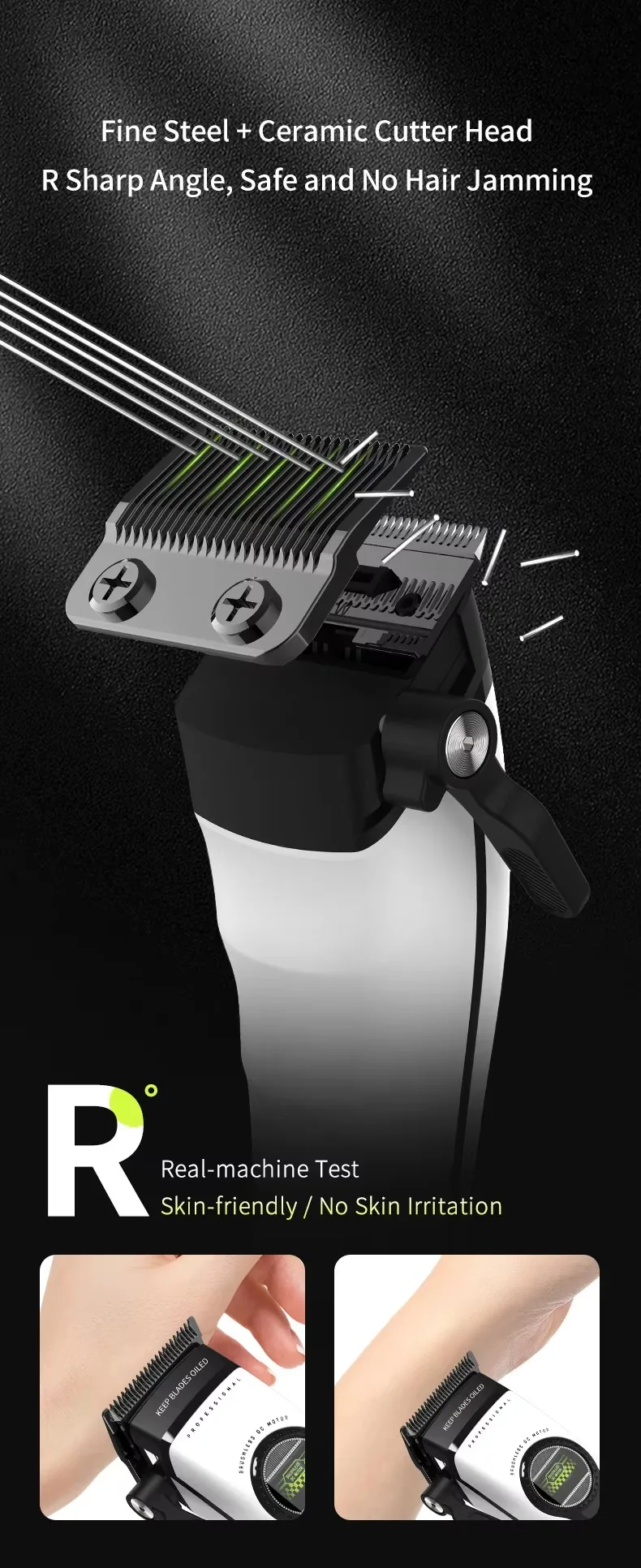 Apresenta lâminas "estáticas" totalmente novas com revestimento DLC.O revestimento DLC os torna duros e de baixo atrito.O design "estático" mantém um ângulo de corte consistente para cortes precisos e uniformes, deixando o cabelo afiado e bem cuidado.