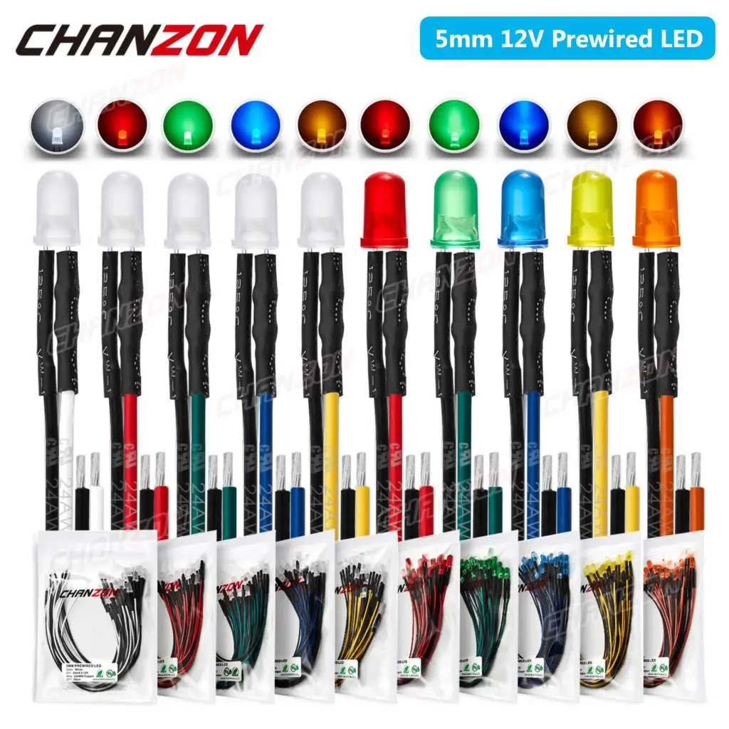 Kit de diodo LED 12V 5mm Branco Vermelho Verde Azul Amarelo Laranja Pré-fio 5 9 12 V Indicador emissor de luz difusa variedade sortida