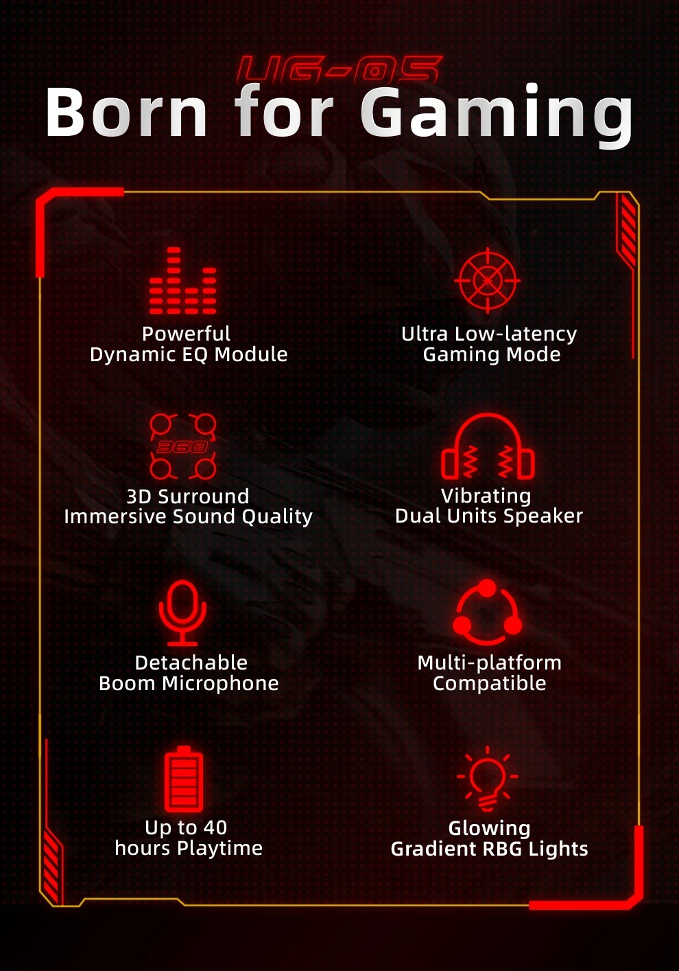 Este fone de ouvido não apenas busca a excelência em desempenho, mas também um design inovador em experiência visual.Os efeitos de iluminação RGB criam uma atmosfera de jogo envolvente.Esteja você em uma batalha final da noite ou em uma sessão casual diurna, o UG-05 torna sua experiência de jogo mais vívida e personalizada com seus efeitos de iluminação deslumbrantes.