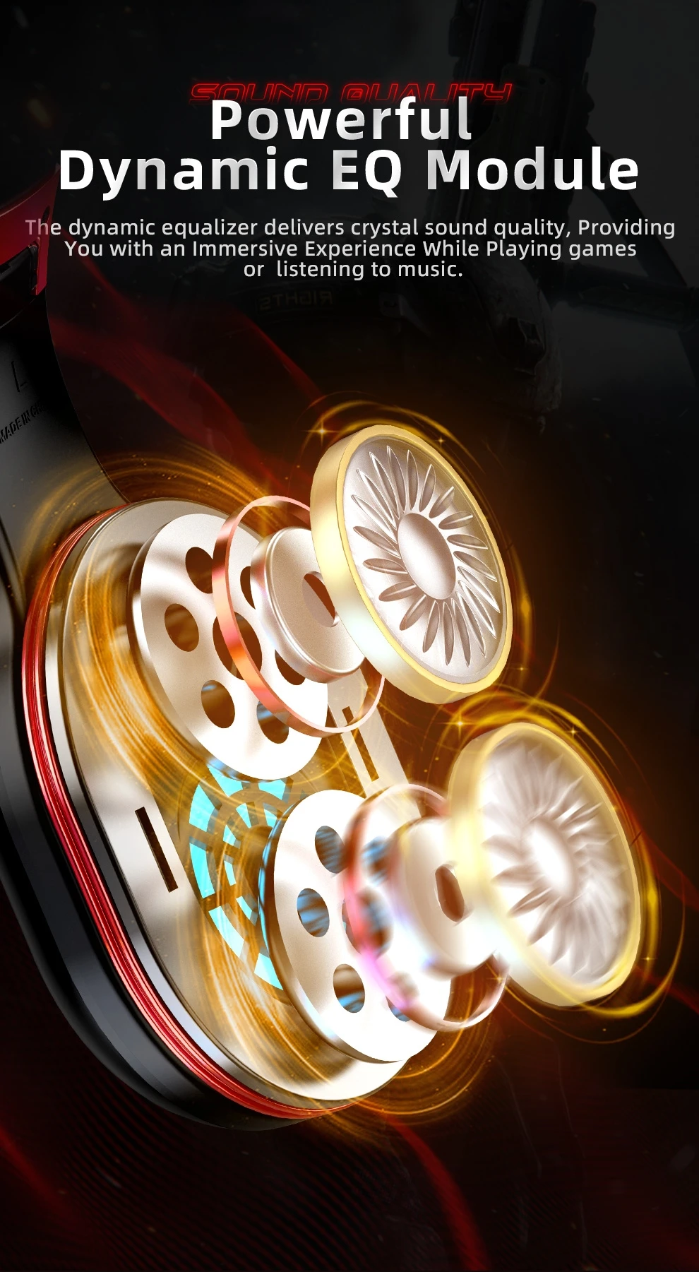 Equipado com tecnologia avançada de equalizador dinâmico para garantir uma qualidade de som excelente.A adição do Dynamic Equaliser torna cada detalhe da música cuidadosamente ajustado e otimizado, tornando os graves mais profundos e poderosos, os médios mais cheios e arredondados, e os agudos mais nítidos e agradáveis ao ouvido.Ele não apenas aumenta a imersão do jogo, mas também faz você se sentir como se estivesse no mundo do jogo.