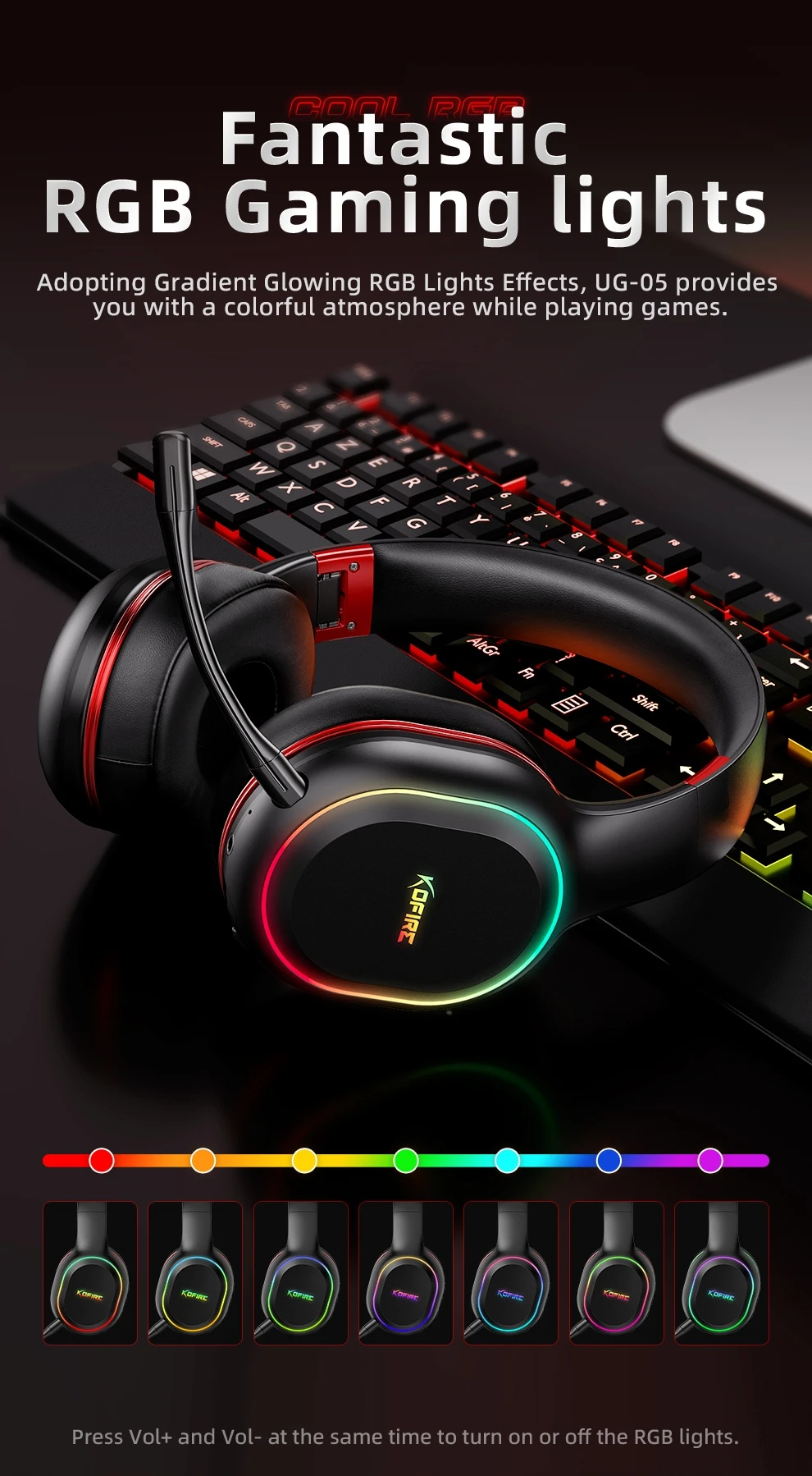 Kofire UG-05 fones de ouvido para jogos 2.4g bt5.0 fone de ouvido sem fio com microfone rbg luz vibração bluetooth fone de ouvido para ps4 ps5 pc switch