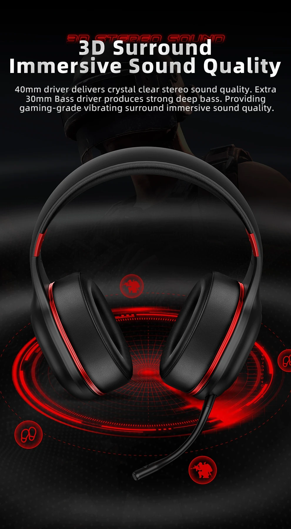 O driver de 40 mm oferece qualidade de som estéreo cristalina, enquanto o driver de graves extra de 30 mm produz graves fortes e profundos.Juntos, eles fornecem uma experiência de som envolvente vibratória para jogos que faz você se sentir como se estivesse no meio do mundo do jogo.