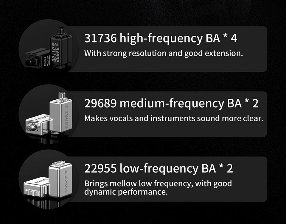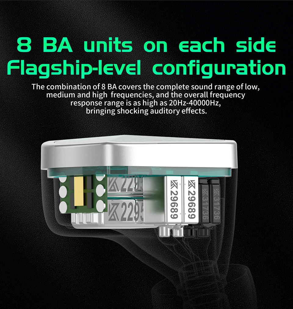 A combinação de 8 BAcobre a faixa de som completa de frequências baixas, médias e altas, e a faixa geral de resposta de frequência é tão alta quanto 20Hz-40000Hz, trazendo efeitos auditivos chocantes.